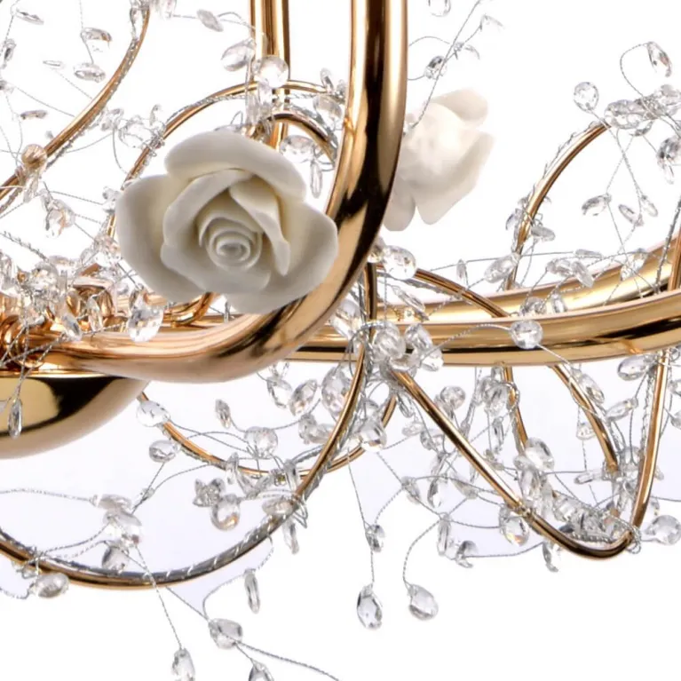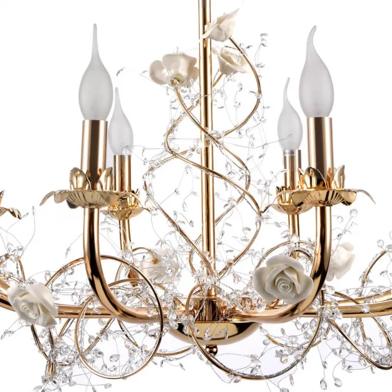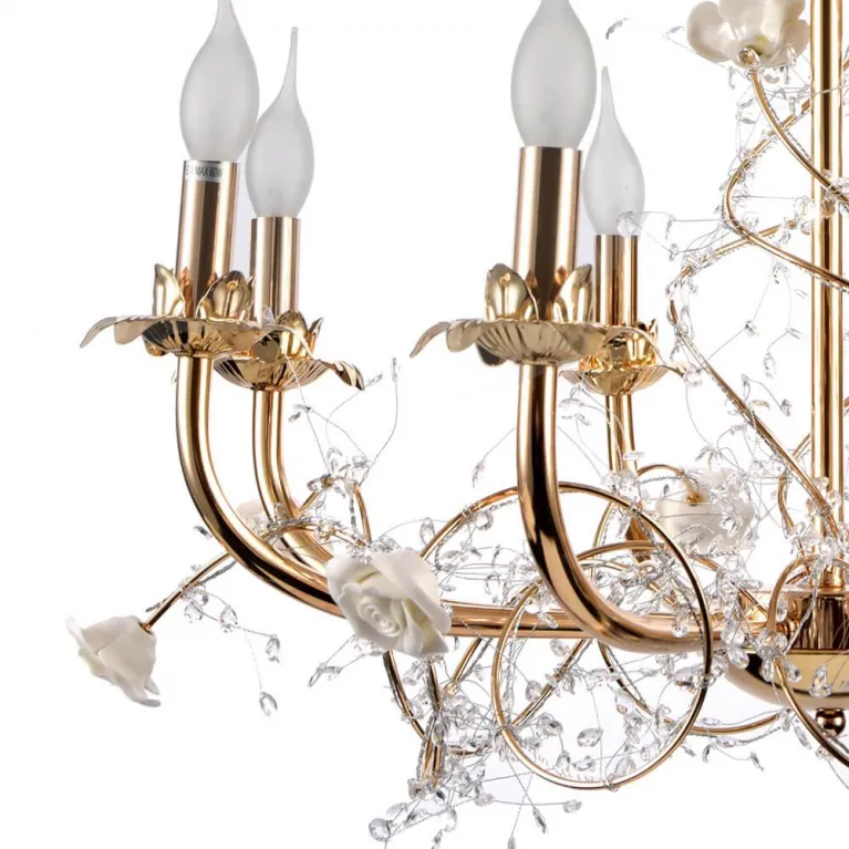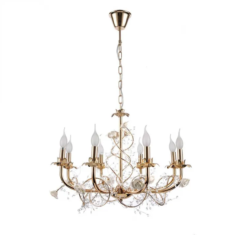 Преобладающий цвет люстры: Золото, арматуры: Золото; материал изготовления арматуры: Металл, размеры, мм: / высота 460 / диаметр 720. Общая мощность – 480 Ватт, а максимальная площадь освещения до 24 м2. Основной тип ламп, предусмотренный производителем: Накаливания с цоколем E14. В зависимости от предпочтений можно использовать лампы теплового, холодного или нейтрального света, за исключением люстр с типом цоколя LED.
