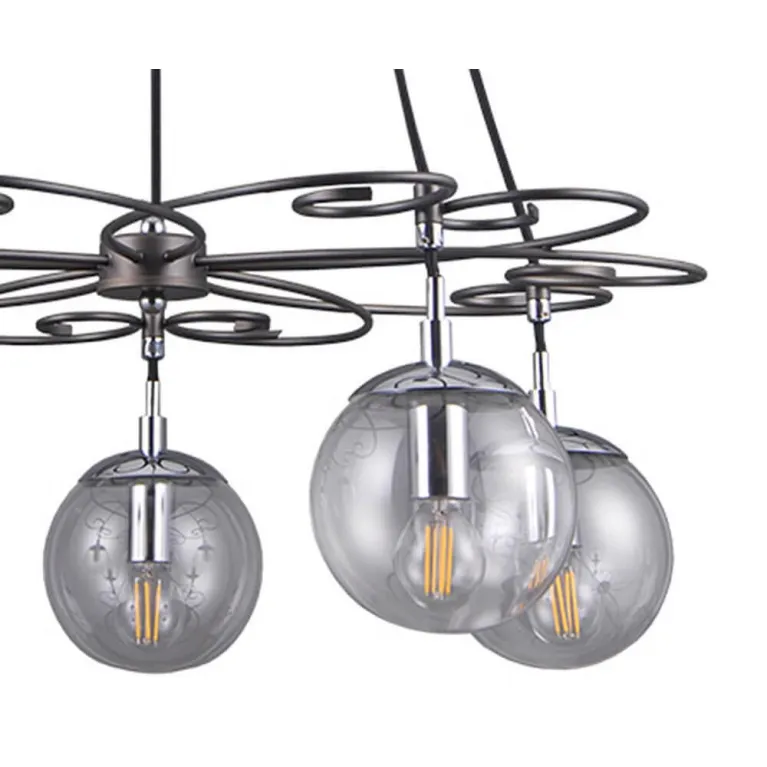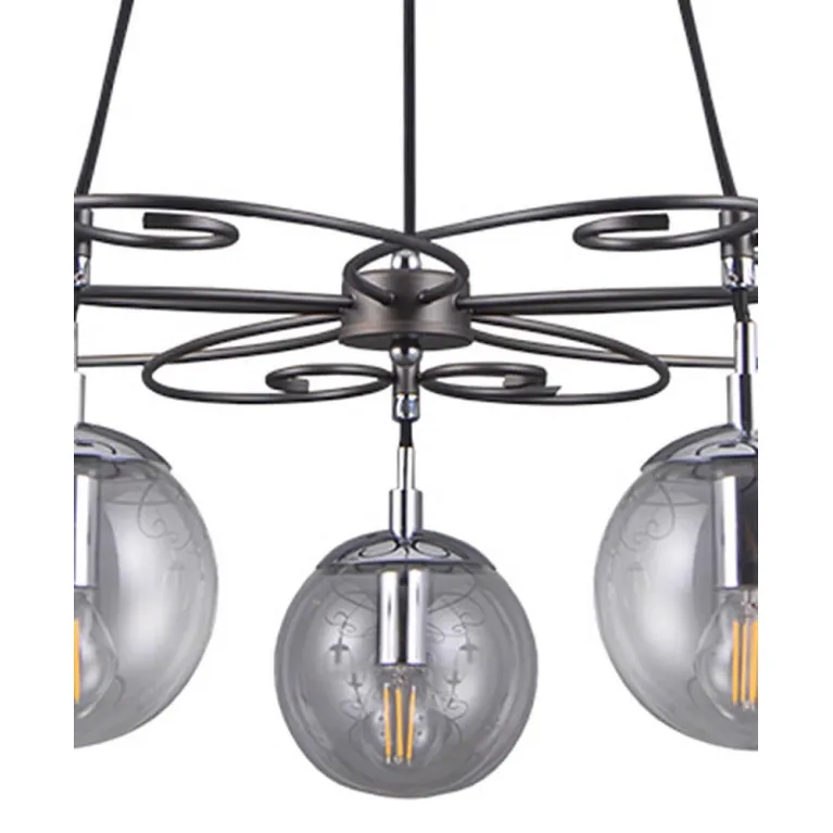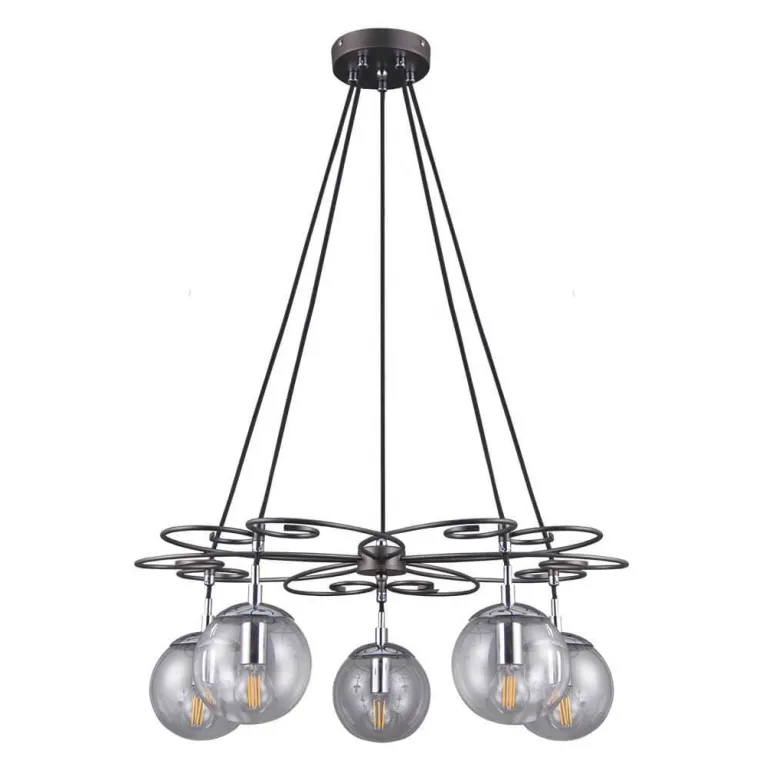 Преобладающий цвет люстры: Дымчатый, плафонов: Дымчатый, арматуры: Тёмно-серый; материал изготовления арматуры: Металл, размеры, мм: / высота 910 / диаметр 610. Общая мощность – 300 Ватт, а максимальная площадь освещения до 15 м2. Основной тип ламп, предусмотренный производителем: Накаливания с цоколем E14. В зависимости от предпочтений можно использовать лампы теплового, холодного или нейтрального света, за исключением люстр с типом цоколя LED.