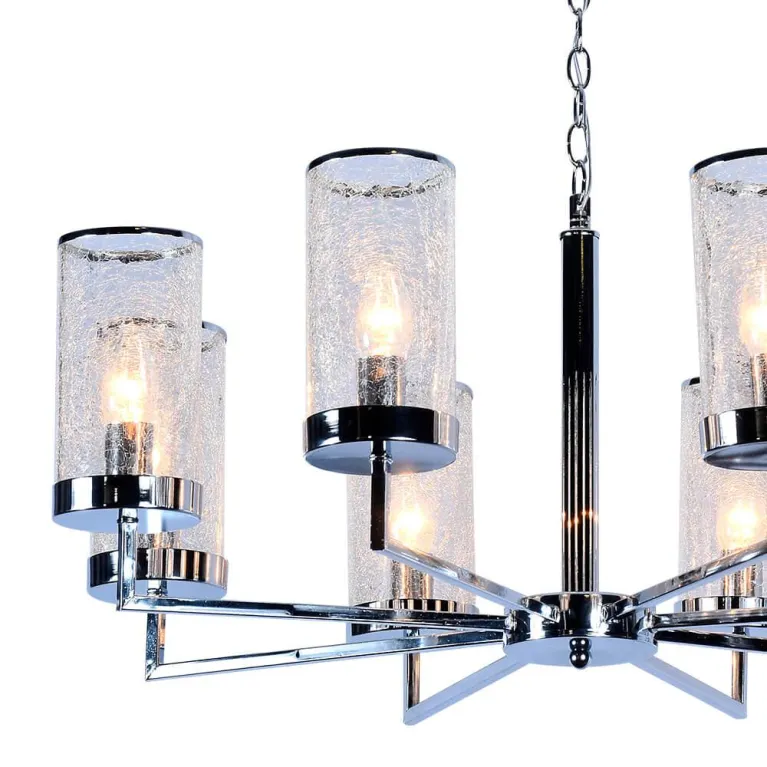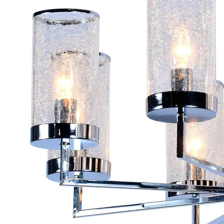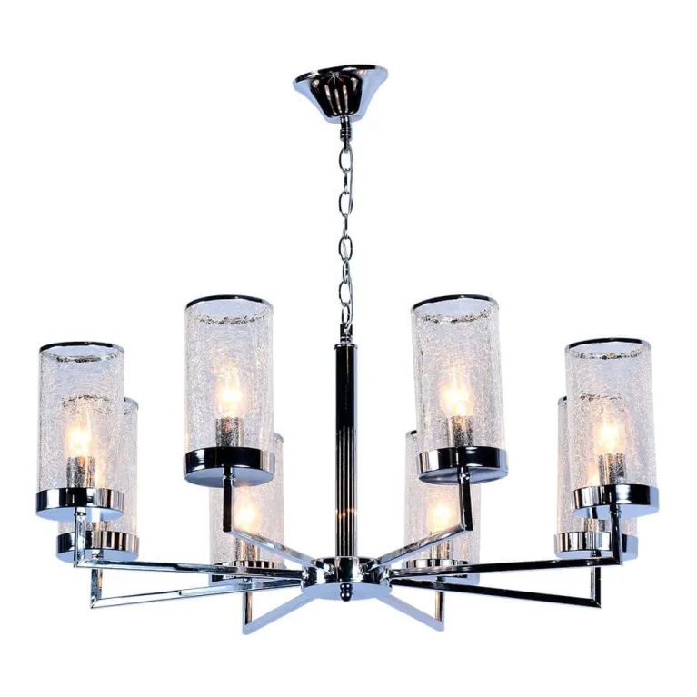 Преобладающий цвет люстры: Хром, плафонов: Прозрачный, арматуры: Хром; материал изготовления арматуры: Металл, размеры, мм: / высота 760 / диаметр 710. Общая мощность – 480 Ватт. Основной тип ламп, предусмотренный производителем: Накаливания с цоколем E27. В зависимости от предпочтений можно использовать лампы теплового, холодного или нейтрального света, за исключением люстр с типом цоколя LED.