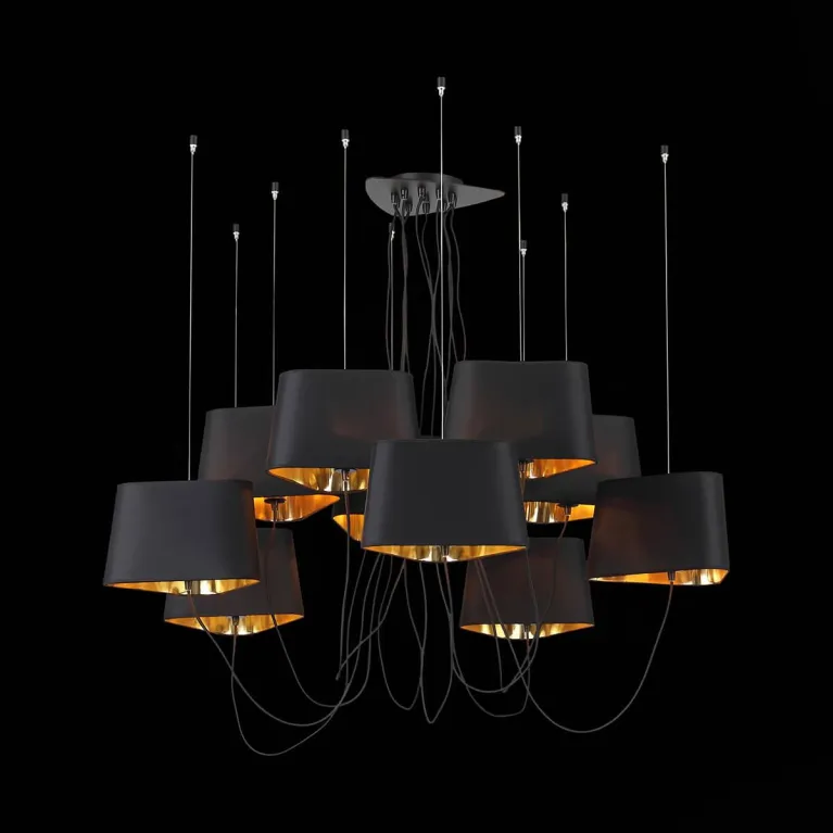 Преобладающий цвет люстры: Черный, плафонов: Черный, арматуры: Черный; материал изготовления арматуры: Металл, размеры, мм: / высота 1700 / диаметр 1700. Общая мощность – 400 Ватт, а максимальная площадь освещения до 20 м2. Основной тип ламп, предусмотренный производителем: Накаливания с цоколем E27. В зависимости от предпочтений можно использовать лампы теплового, холодного или нейтрального света, за исключением люстр с типом цоколя LED.