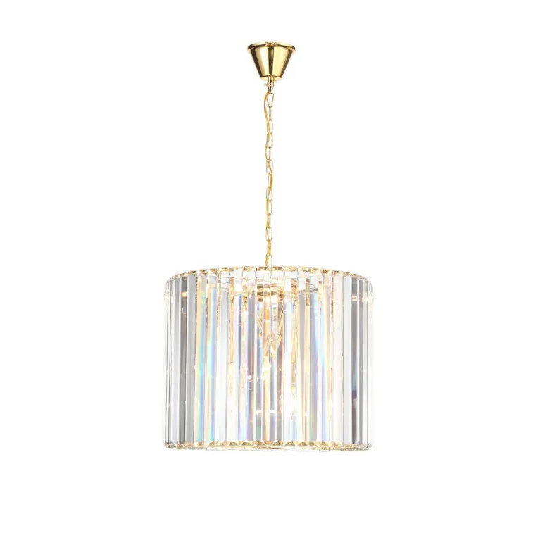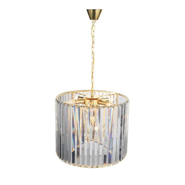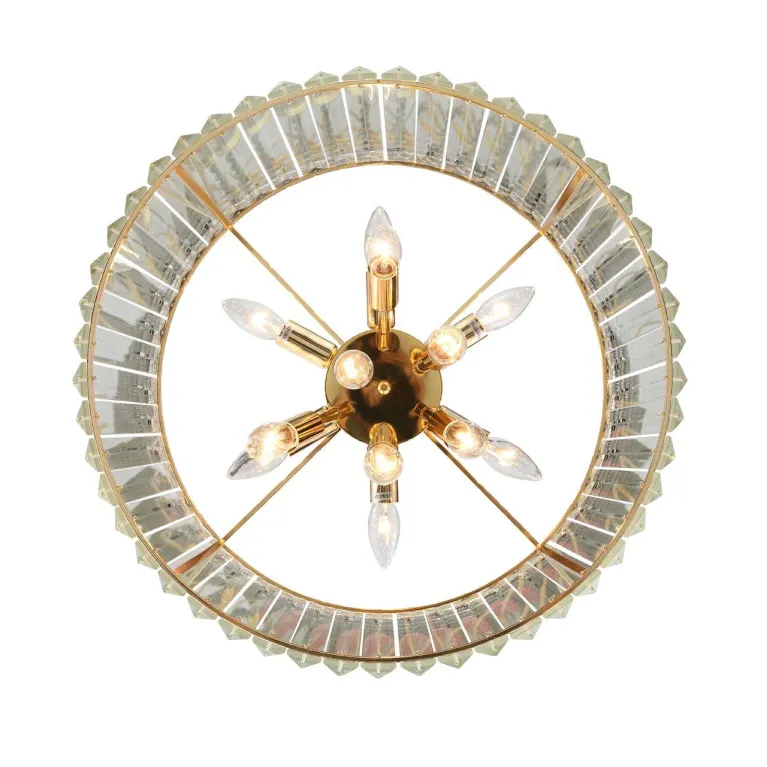 Преобладающий цвет люстры: Золото, плафонов: Прозрачный, арматуры: Золото; материал изготовления арматуры: Металл, размеры, мм: / высота 430 / диаметр 500. Общая мощность – 480 Ватт, а максимальная площадь освещения до 24 м2. Основной тип ламп, предусмотренный производителем: Накаливания с цоколем E14. В зависимости от предпочтений можно использовать лампы теплового, холодного или нейтрального света, за исключением люстр с типом цоколя LED.