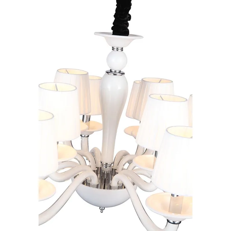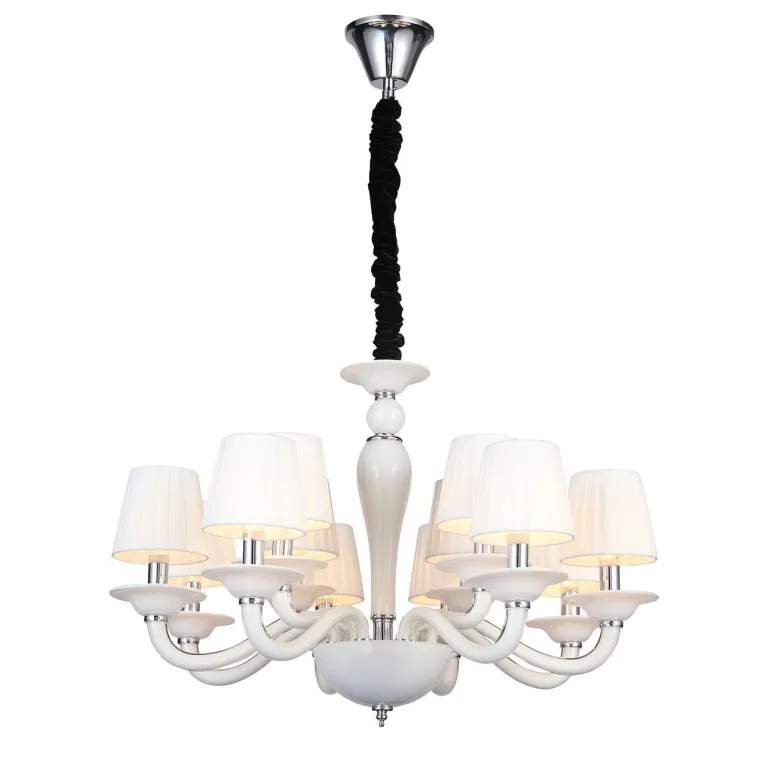 Преобладающий цвет люстры: Белый, плафонов: Белый, арматуры: Белый; материал изготовления арматуры: Металл, размеры, мм: / высота 500 / диаметр 700. Общая мощность – 480 Ватт, а максимальная площадь освещения до 24 м2. Основной тип ламп, предусмотренный производителем: Накаливания с цоколем E14. В зависимости от предпочтений можно использовать лампы теплового, холодного или нейтрального света, за исключением люстр с типом цоколя LED.