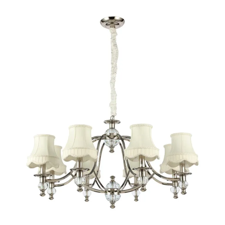 Преобладающий цвет люстры: Белый, плафонов: Белый, арматуры: Никель; материал изготовления арматуры: Металл, размеры, мм: / высота 490 / диаметр 880. Общая мощность – 320 Ватт, а максимальная площадь освещения до 16 м2. Основной тип ламп, предусмотренный производителем: Накаливания с цоколем E14. В зависимости от предпочтений можно использовать лампы теплового, холодного или нейтрального света, за исключением люстр с типом цоколя LED.