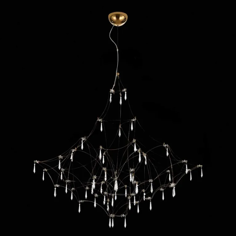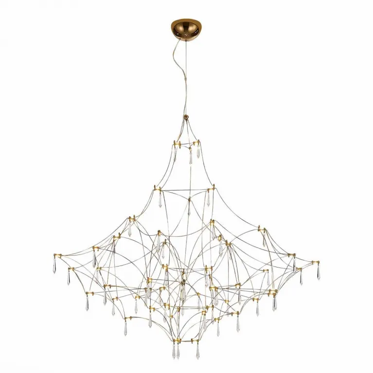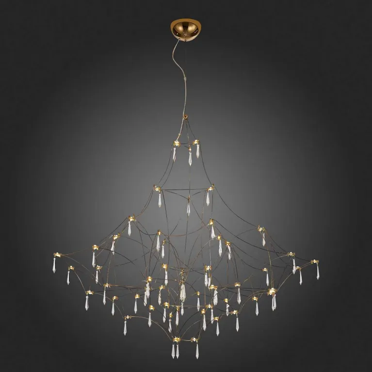 Преобладающий цвет люстры: Золотой, арматуры: Золотой; материал изготовления арматуры: Металл, размеры, мм: / высота 1200 / диаметр 1200. Общая мощность – 51 Ватт, а максимальная площадь освещения до 18 м2. Основной тип ламп, предусмотренный производителем: Светодиодная с цоколем LED. В зависимости от предпочтений можно использовать лампы теплового, холодного или нейтрального света, за исключением люстр с типом цоколя LED.