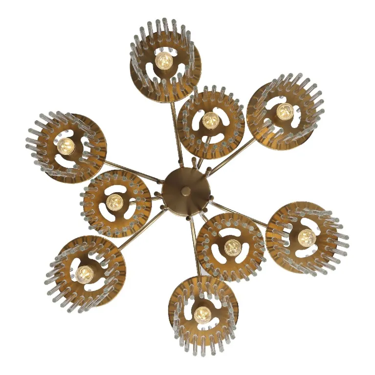 Преобладающий цвет плафонов: Прозрачный, арматуры: Латунь; материал изготовления арматуры: Металл, размеры, мм: / высота 2090 / диаметр 670. Общая мощность – 360 Ватт, а максимальная площадь освещения до 18 м2. Основной тип ламп, предусмотренный производителем: Накаливания с цоколем E14. В зависимости от предпочтений можно использовать лампы теплового, холодного или нейтрального света, за исключением люстр с типом цоколя LED.