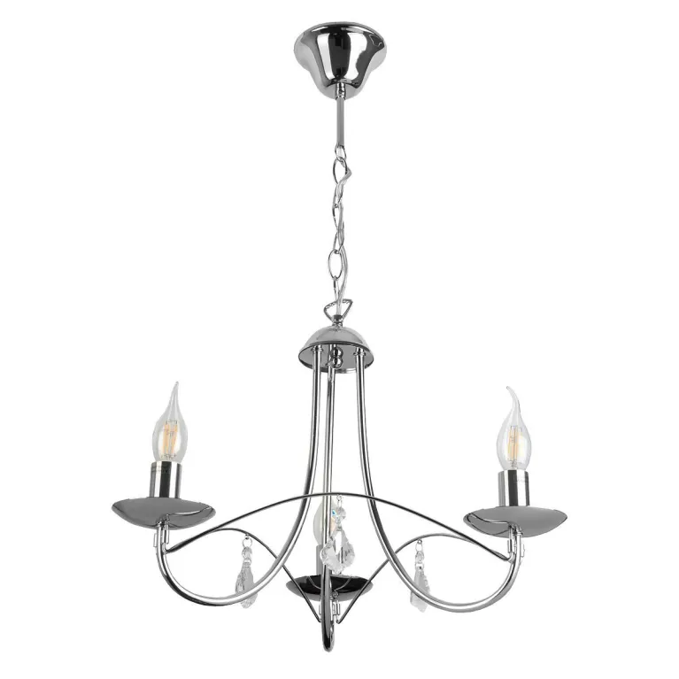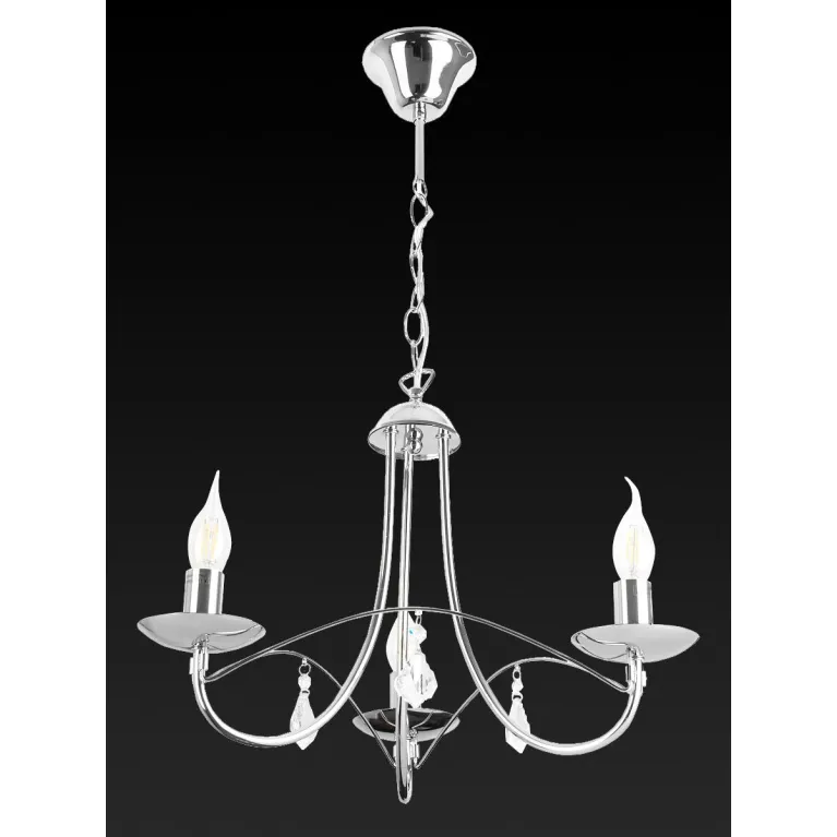 Люстра выполнена в хромированном корпусе и украшена белыми матовыми абажурами, которые обеспечивают мягкое и равномерное рассеивание света. Она совместима с лампами типа E14 и может использоваться как для ламп накаливания, так и для энергосберегающих или светодиодных ламп, что обеспечивает максимальную гибкость в выборе источников света.
