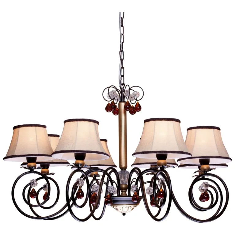 Преобладающий цвет плафонов: Бежевый, арматуры: Черный; материал изготовления арматуры: Металл, размеры, мм: / высота 1010 / диаметр 930. Общая мощность – 320 Ватт, а максимальная площадь освещения до 16 м2. Основной тип ламп, предусмотренный производителем: Накаливания с цоколем E14. В зависимости от предпочтений можно использовать лампы теплового, холодного или нейтрального света, за исключением люстр с типом цоколя LED.