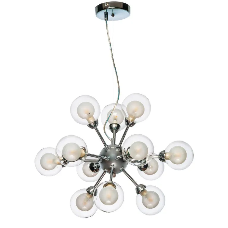 Преобладающий цвет люстры: Хром, плафонов: Прозрачный, арматуры: Хром; материал изготовления арматуры: Металл, размеры, мм: / высота 360 / диаметр 480. Общая мощность – 336 Ватт. Основной тип ламп, предусмотренный производителем: Галогеновая с цоколем G9. В зависимости от предпочтений можно использовать лампы теплового, холодного или нейтрального света, за исключением люстр с типом цоколя LED.