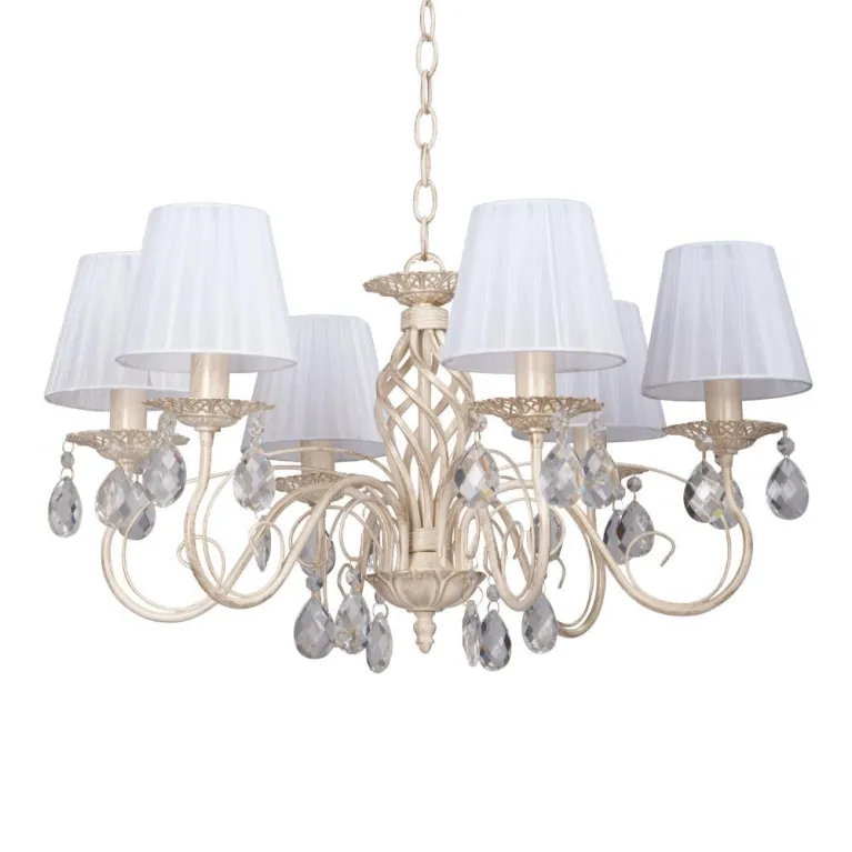 Преобладающий цвет люстры: Белый, плафонов: Белый, арматуры: Бежевый; материал изготовления арматуры: Металл, размеры, мм: / ширина 590 / высота 900 Общая мощность – 360 Ватт, а максимальная площадь освещения до 18 м2. Основной тип ламп, предусмотренный производителем: Накаливания с цоколем E14. В зависимости от предпочтений можно использовать лампы теплового, холодного или нейтрального света, за исключением люстр с типом цоколя LED.