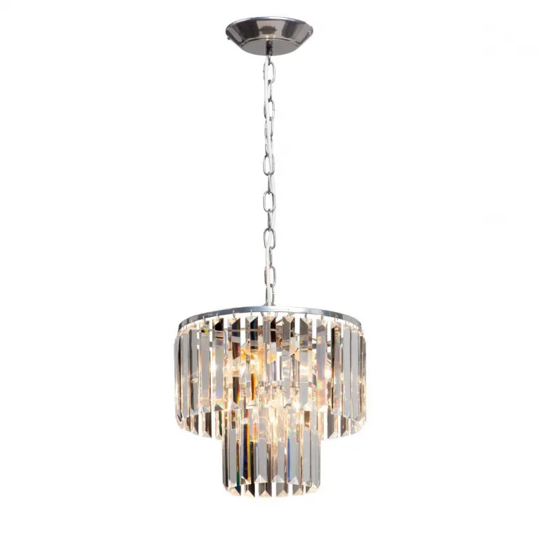 Преобладающий цвет люстры: Серебро, плафонов: Прозрачный, арматуры: Серебро; материал изготовления арматуры: Металл, размеры, мм: / высота 810 / диаметр 310. Общая мощность – 240 Ватт, а максимальная площадь освещения до 12 м2. Основной тип ламп, предусмотренный производителем: Накаливания с цоколем E14. В зависимости от предпочтений можно использовать лампы теплового, холодного или нейтрального света, за исключением люстр с типом цоколя LED.