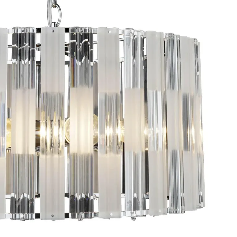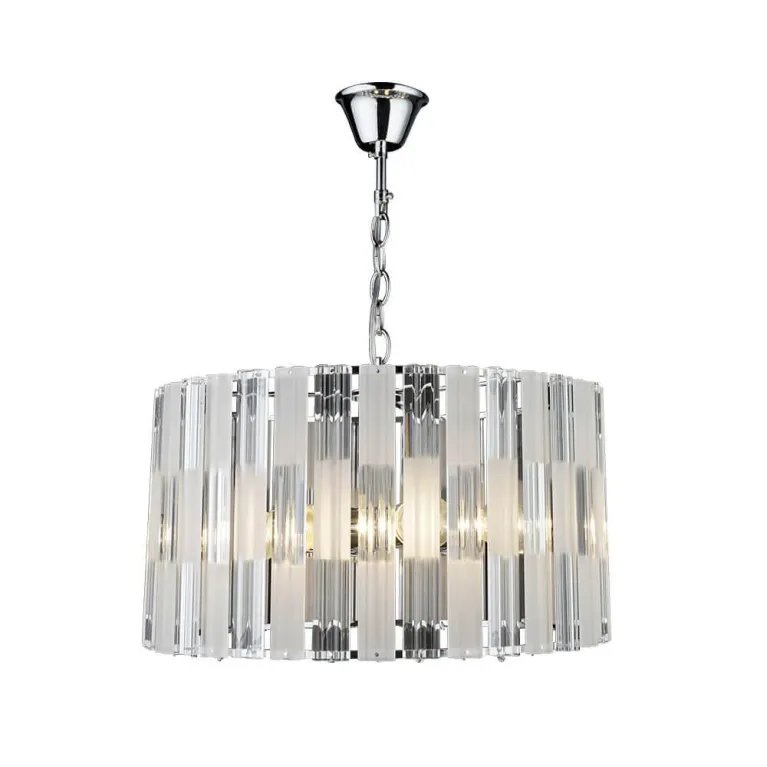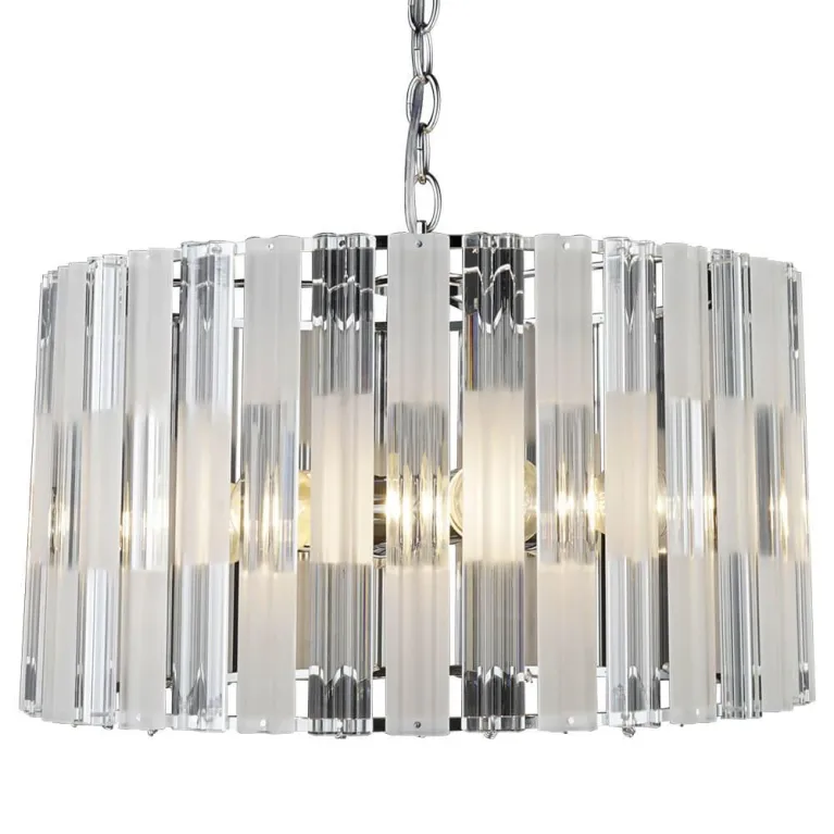 Преобладающий цвет люстры: Хром, плафонов: Прозрачный, арматуры: Хром; материал изготовления арматуры: Металл, размеры, мм: / высота 220 / диаметр 400. Общая мощность – 360 Ватт, а максимальная площадь освещения до 20 м2. Основной тип ламп, предусмотренный производителем: Накаливания с цоколем E27. В зависимости от предпочтений можно использовать лампы теплового, холодного или нейтрального света, за исключением люстр с типом цоколя LED.