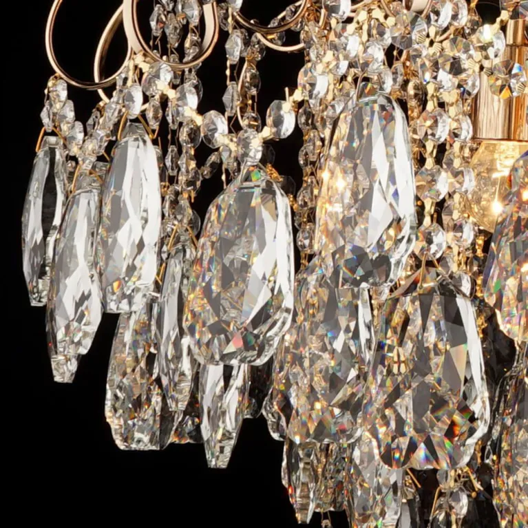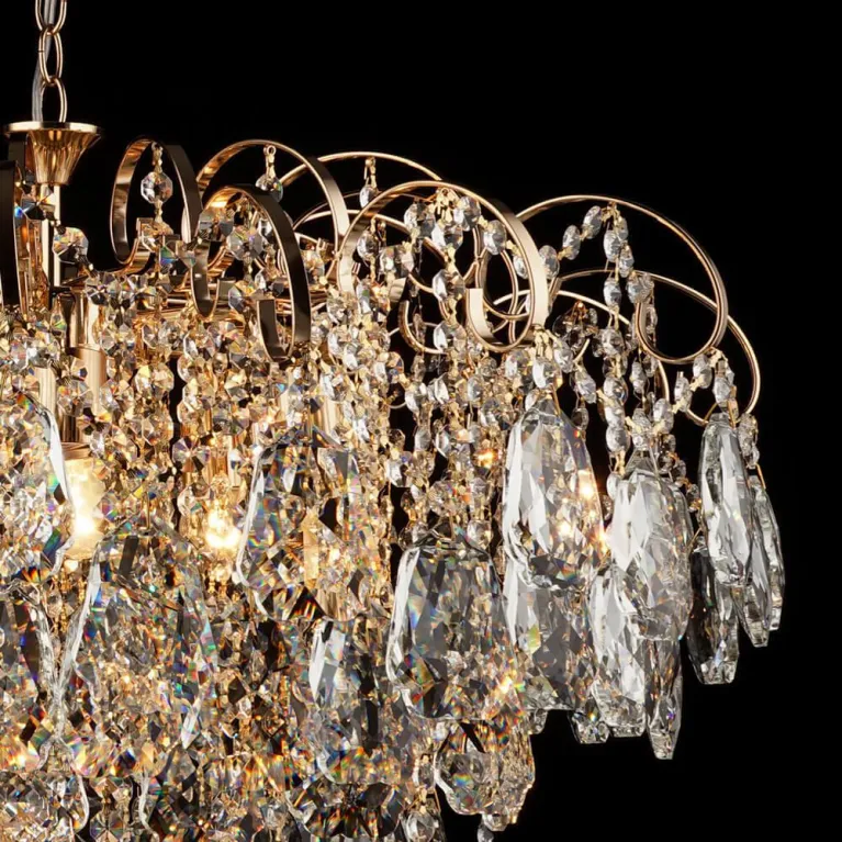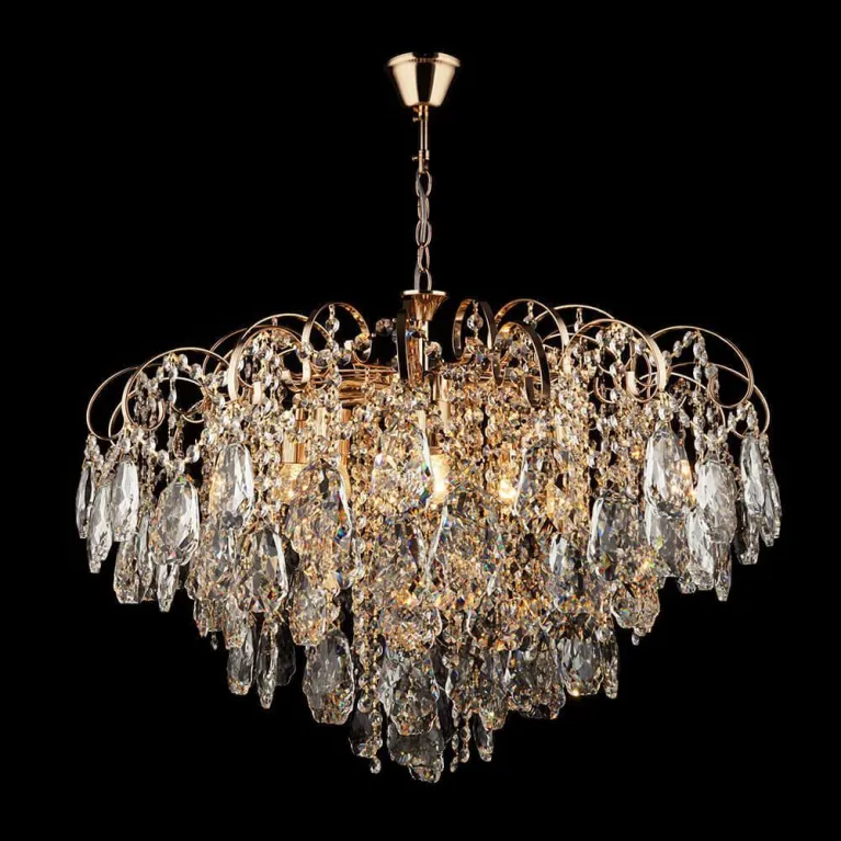 Преобладающий цвет люстры: Золотой, арматуры: Золотой; материал изготовления арматуры: Металл, размеры, мм: / высота 560 / диаметр 720. Общая мощность – 480 Ватт, а максимальная площадь освещения до 26,7 м2. Основной тип ламп, предусмотренный производителем: Накаливания с цоколем E27. В зависимости от предпочтений можно использовать лампы теплового, холодного или нейтрального света, за исключением люстр с типом цоколя LED.