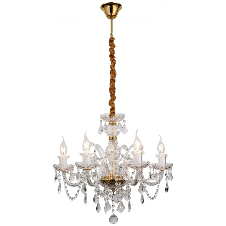 Преобладающий цвет арматуры: Золото; материал изготовления арматуры: Металл, размеры, мм: / высота 520 / диаметр 560. Общая мощность – 200 Ватт, а максимальная площадь освещения до 10 м2. Основной тип ламп, предусмотренный производителем: Накаливания с цоколем E14. В зависимости от предпочтений можно использовать лампы теплового, холодного или нейтрального света, за исключением люстр с типом цоколя LED.