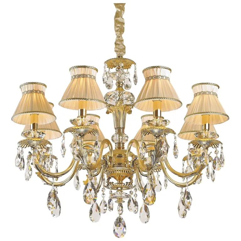Преобладающий цвет плафонов: Бежевый, арматуры: Золото; материал изготовления арматуры: Металл, размеры, мм: / высота 580 / диаметр 750. Общая мощность – 320 Ватт, а максимальная площадь освещения до 16 м2. Основной тип ламп, предусмотренный производителем: Накаливания с цоколем E14. В зависимости от предпочтений можно использовать лампы теплового, холодного или нейтрального света, за исключением люстр с типом цоколя LED.