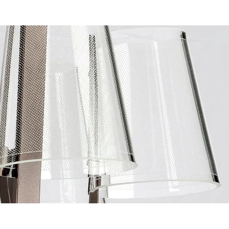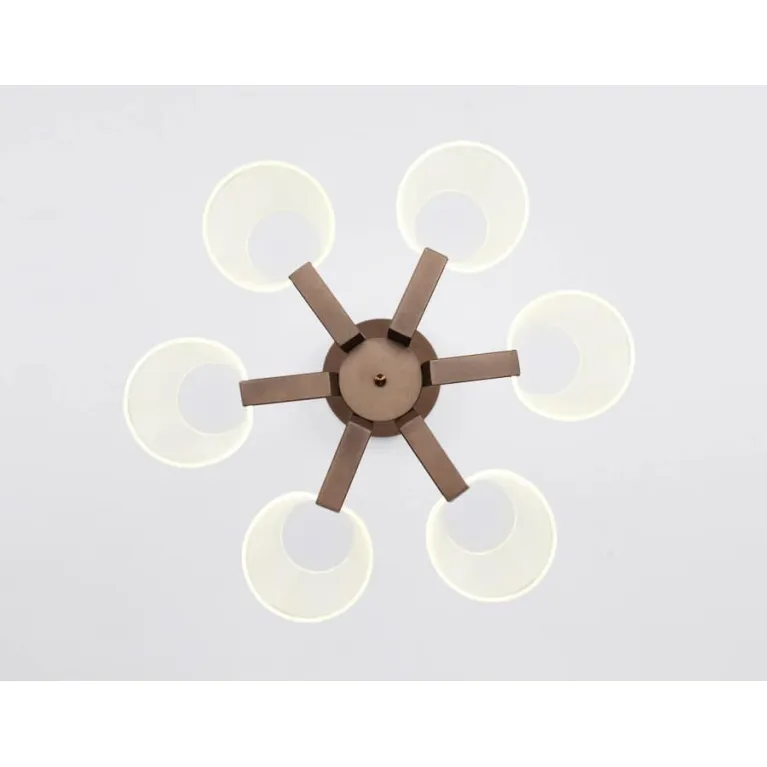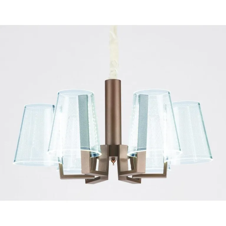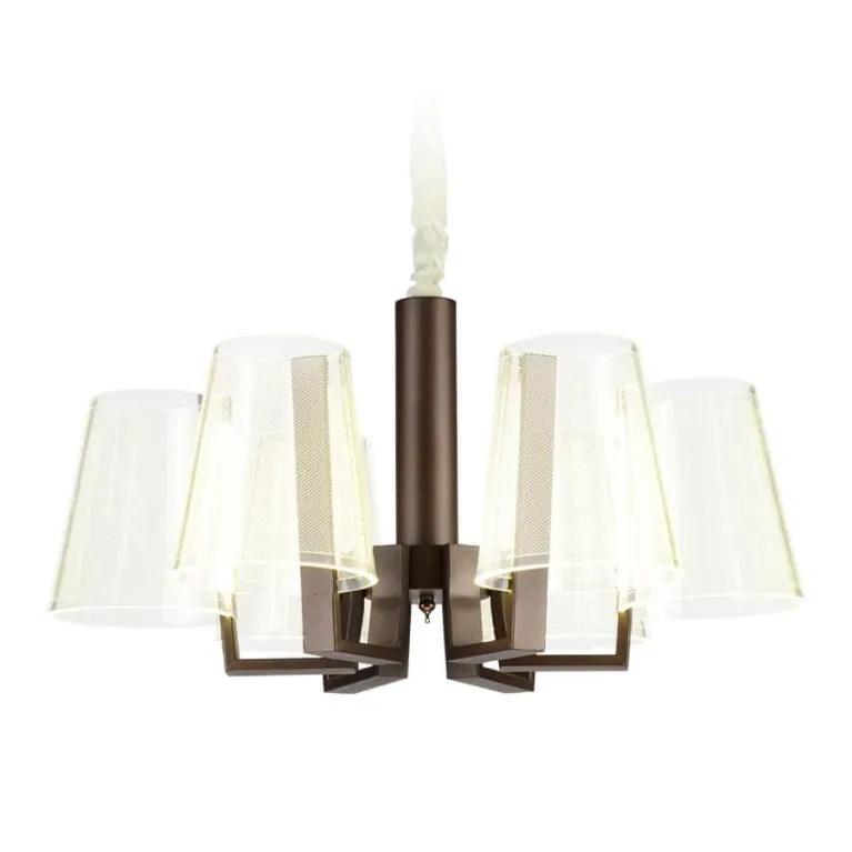 Преобладающий цвет люстры: Кофейный, плафонов: Прозрачный, арматуры: Кофейный; материал изготовления арматуры: Металл, размеры, мм: / высота 230 / диаметр 600. Общая мощность – 96 Ватт, а максимальная площадь освещения до 20 м2. Основной тип ламп, предусмотренный производителем: Светодиодная с цоколем LED. В зависимости от предпочтений можно использовать лампы теплового, холодного или нейтрального света, за исключением люстр с типом цоколя LED.
