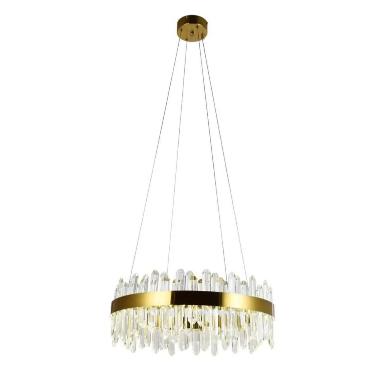 Преобладающий цвет люстры: Золотой, плафонов: Прозрачный, арматуры: Золотой; материал изготовления арматуры: Металл, размеры, мм: / высота 1400 / диаметр 780. Общая мощность – 106 Ватт. Основной тип ламп, предусмотренный производителем: Светодиодная с цоколем LED. В зависимости от предпочтений можно использовать лампы теплового, холодного или нейтрального света, за исключением люстр с типом цоколя LED.