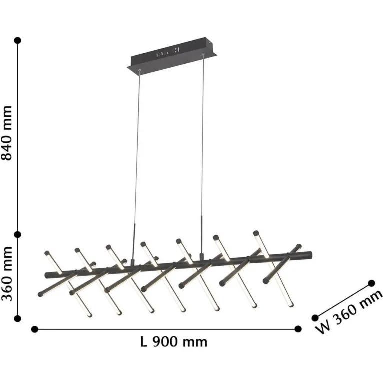 Преобладающий цвет люстры: Черный, плафонов: Белый, арматуры: Черный; материал изготовления арматуры: Металл, размеры, мм: длина 900 / ширина 360 / высота 360 Общая мощность – 84 Ватт. Основной тип ламп, предусмотренный производителем: Светодиодная с цоколем LED. В зависимости от предпочтений можно использовать лампы теплового, холодного или нейтрального света, за исключением люстр с типом цоколя LED.