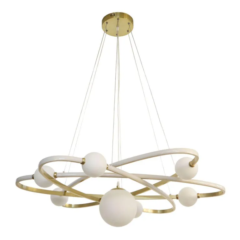 Преобладающий цвет люстры: Белый, плафонов: Белый, арматуры: Золотой; материал изготовления арматуры: Металл, размеры, мм: / высота 1750 / диаметр 1050. Общая мощность – 96 Ватт. Основной тип ламп, предусмотренный производителем: с цоколем LED. В зависимости от предпочтений можно использовать лампы теплового, холодного или нейтрального света, за исключением люстр с типом цоколя LED.