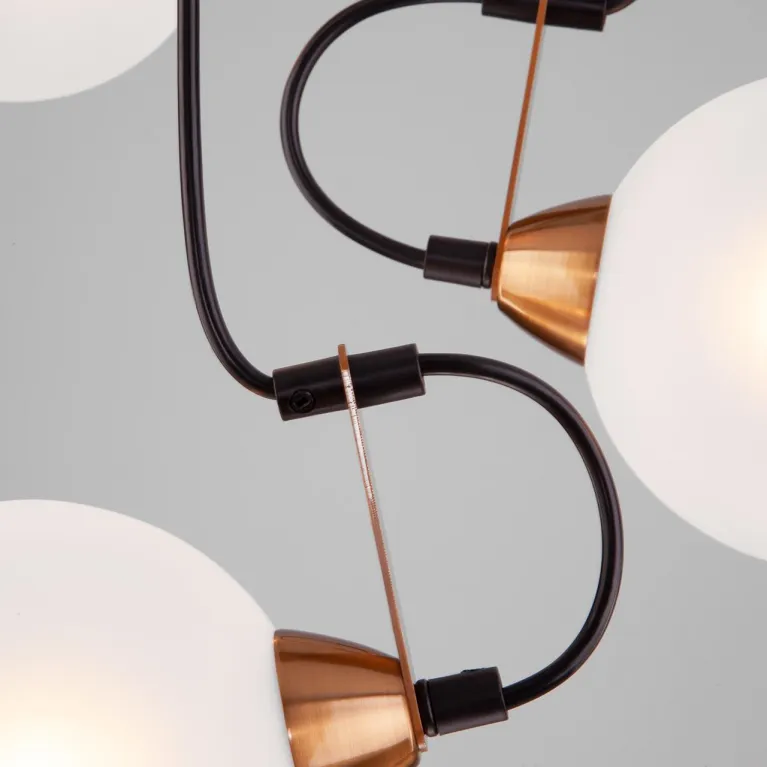 Преобладающий цвет люстры: Белый, плафонов: Белый, арматуры: Черный; материал изготовления арматуры: Металл, размеры, мм: / высота 710 / диаметр 345. Общая мощность – 120 Ватт, а максимальная площадь освещения до 8 м2. Основной тип ламп, предусмотренный производителем: Накаливания с цоколем E14. В зависимости от предпочтений можно использовать лампы теплового, холодного или нейтрального света, за исключением люстр с типом цоколя LED.