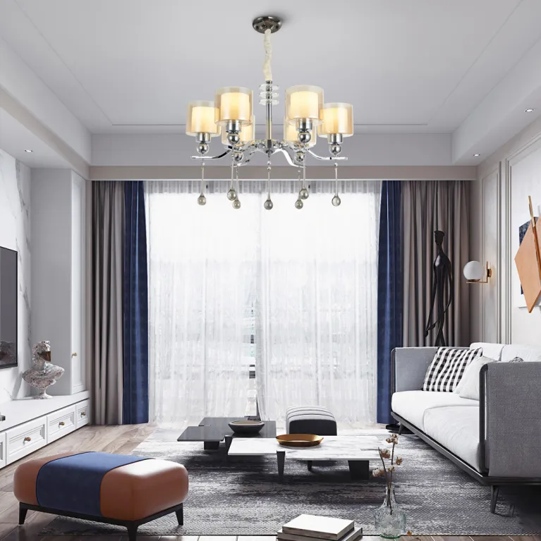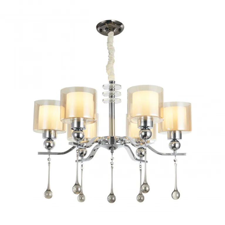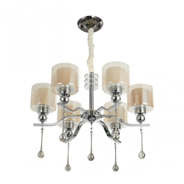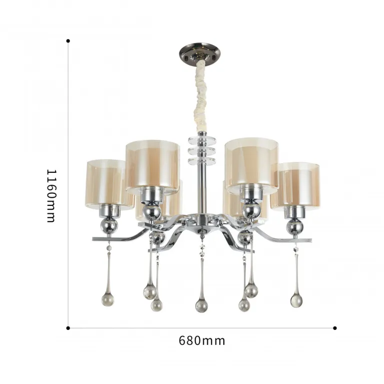 Преобладающий цвет плафонов: Прозрачный, арматуры: Никель; материал изготовления арматуры: Металл, размеры, мм: длина 560 / высота 560 / диаметр 680. Общая мощность – 240 Ватт. Основной тип ламп, предусмотренный производителем: Накаливания с цоколем E27. В зависимости от предпочтений можно использовать лампы теплового, холодного или нейтрального света, за исключением люстр с типом цоколя LED.