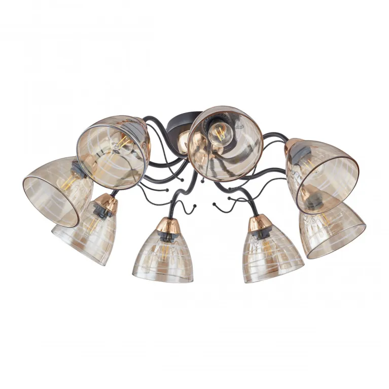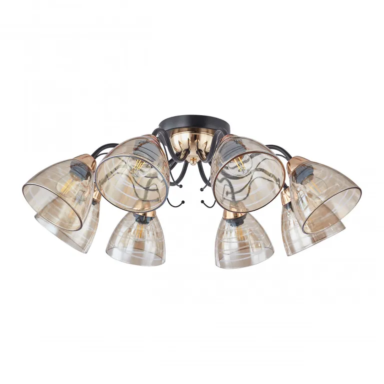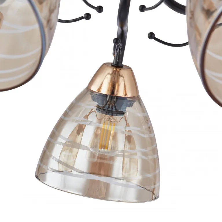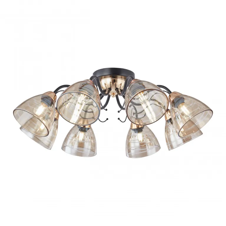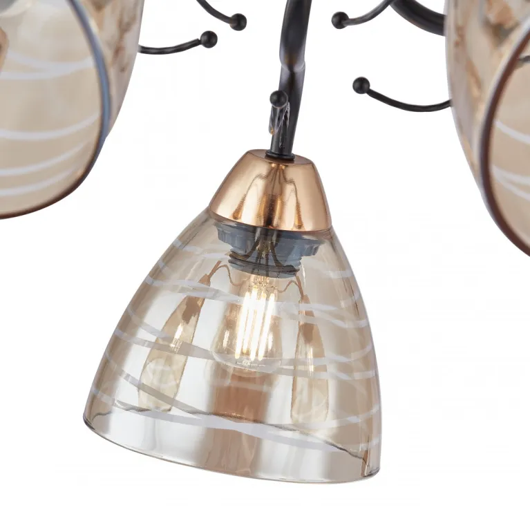 Преобладающий цвет плафонов: Янтарный, арматуры: Черный; материал изготовления арматуры: Металл, размеры, мм: длина 240 / высота 240 / диаметр 700. Общая мощность – 320 Ватт. Основной тип ламп, предусмотренный производителем: Накаливания с цоколем E27. В зависимости от предпочтений можно использовать лампы теплового, холодного или нейтрального света, за исключением люстр с типом цоколя LED.