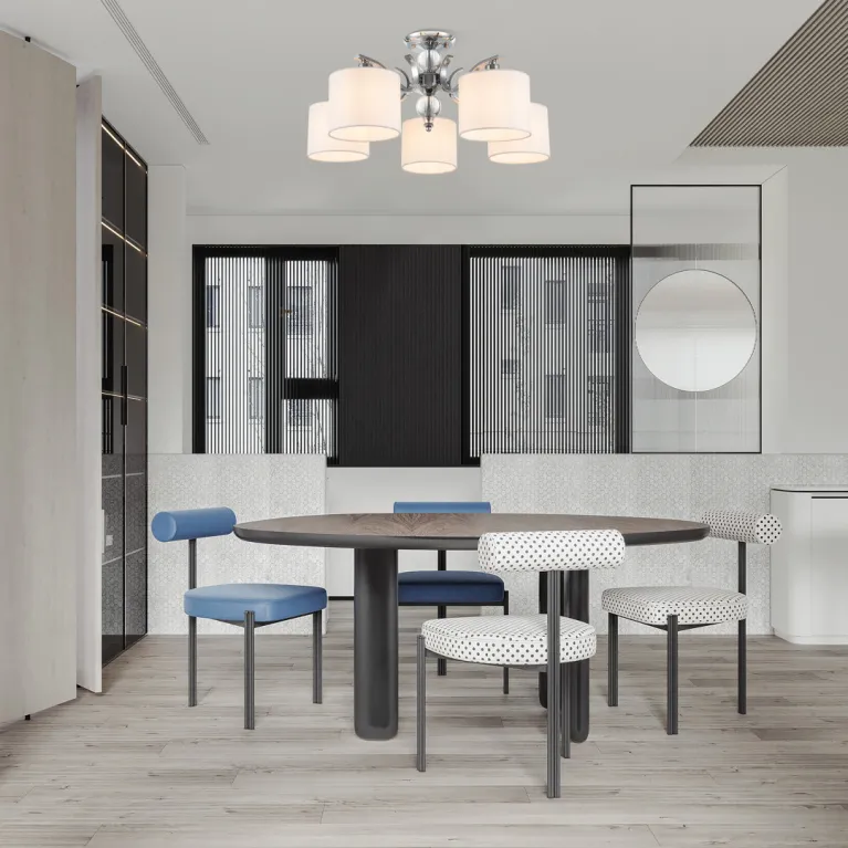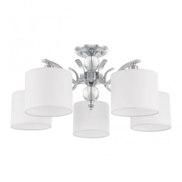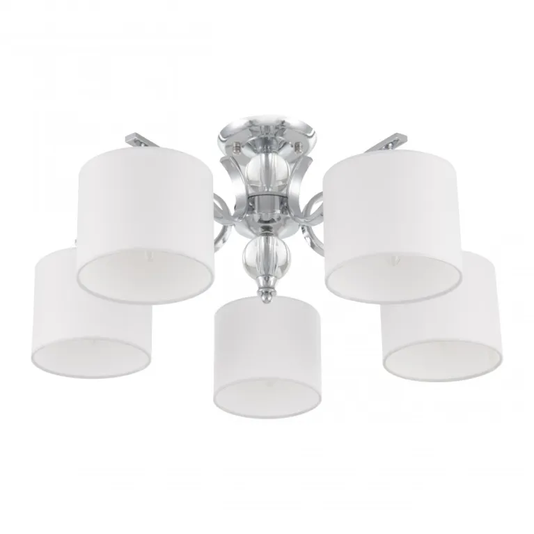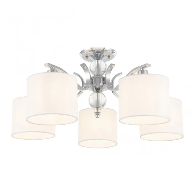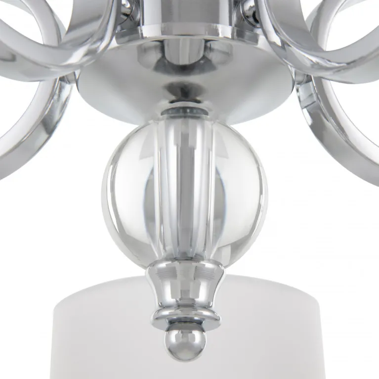 Преобладающий цвет плафонов: Белый, арматуры: Хром; материал изготовления арматуры: Металл, размеры, мм: длина 270 / высота 270 / диаметр 600. Общая мощность – 200 Ватт. Основной тип ламп, предусмотренный производителем: Накаливания с цоколем E14. В зависимости от предпочтений можно использовать лампы теплового, холодного или нейтрального света, за исключением люстр с типом цоколя LED.