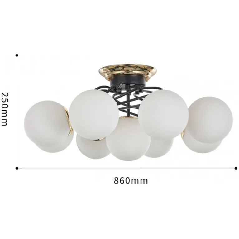 Преобладающий цвет плафонов: Белый, арматуры: Золото; материал изготовления арматуры: Металл, размеры, мм: длина 250 / высота 250 / диаметр 860. Общая мощность – 360 Ватт, а максимальная площадь освещения до 18 м2. Основной тип ламп, предусмотренный производителем: Накаливания с цоколем E27. В зависимости от предпочтений можно использовать лампы теплового, холодного или нейтрального света, за исключением люстр с типом цоколя LED.