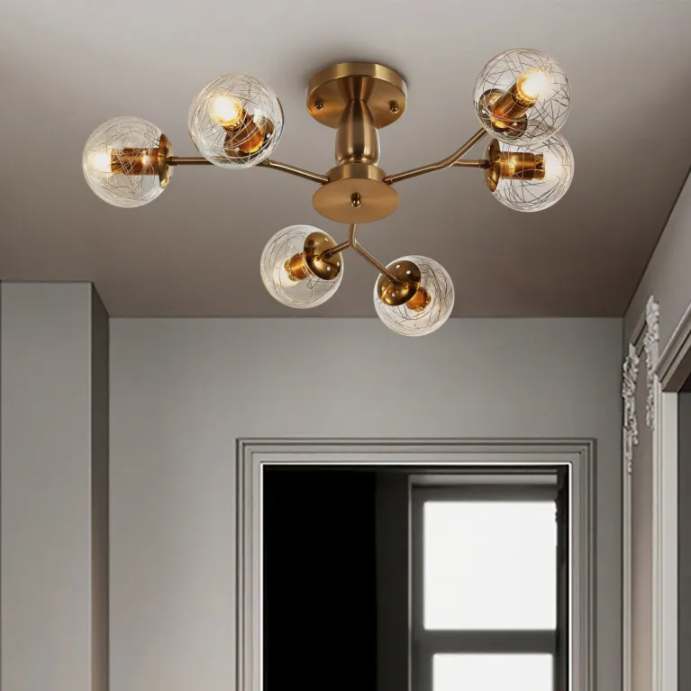 Преобладающий цвет плафонов: Прозрачный, арматуры: Золото; материал изготовления арматуры: Металл, размеры, мм: длина 200 / высота 200 / диаметр 760. Общая мощность – 240 Ватт. Основной тип ламп, предусмотренный производителем: Накаливания с цоколем E27. В зависимости от предпочтений можно использовать лампы теплового, холодного или нейтрального света, за исключением люстр с типом цоколя LED.
