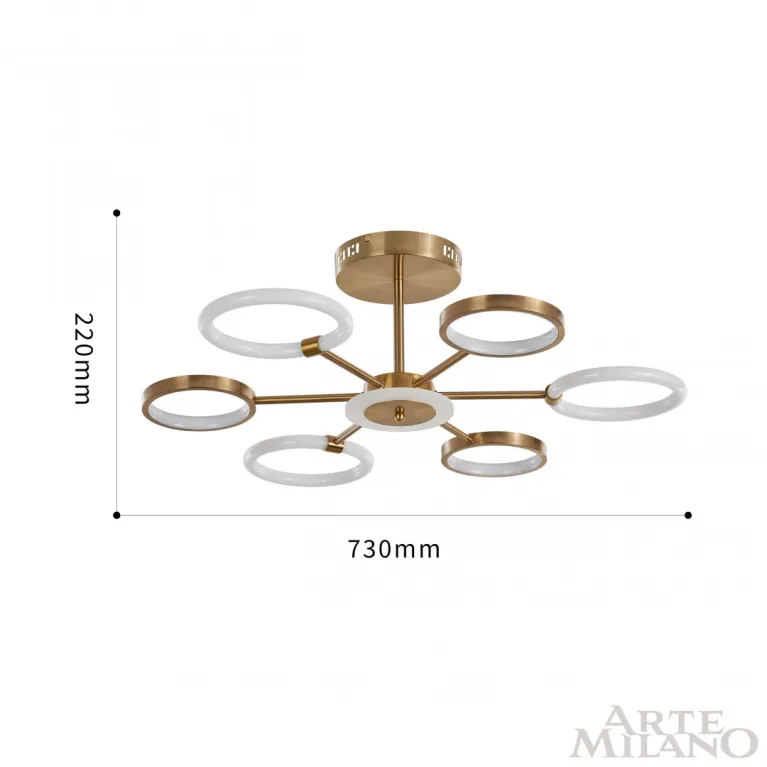 Преобладающий цвет плафонов: Белый, арматуры: Золото; материал изготовления арматуры: Металл, размеры, мм: длина 220 / высота 220 / диаметр 730. Общая мощность – 50 Ватт. Основной тип ламп, предусмотренный производителем: Светодиодная с цоколем LED. В зависимости от предпочтений можно использовать лампы теплового, холодного или нейтрального света, за исключением люстр с типом цоколя LED.