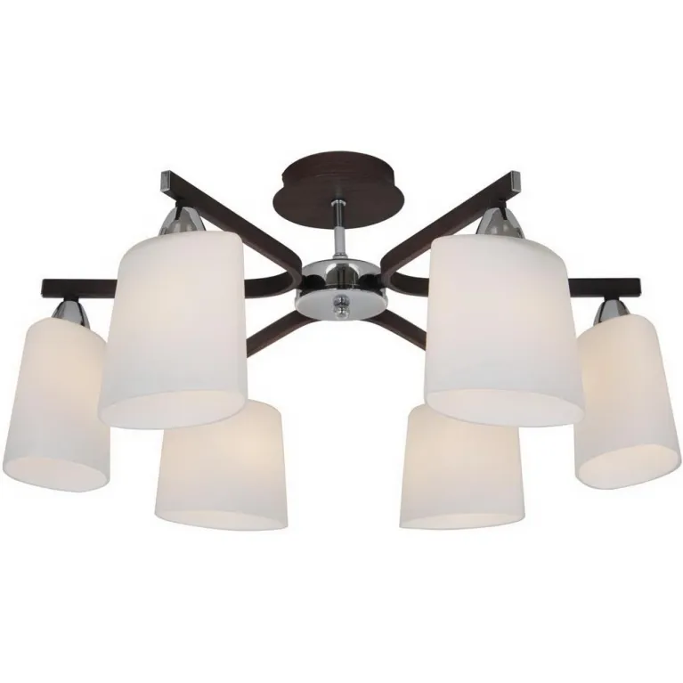 Преобладающий цвет люстры: Белый, плафонов: Белый, арматуры: Коричневый; материал изготовления арматуры: Дерево, размеры, мм: / высота 280 / диаметр 580. Общая мощность – 360 Ватт, а максимальная площадь освещения до 20 м2. Основной тип ламп, предусмотренный производителем: Накаливания с цоколем E14. В зависимости от предпочтений можно использовать лампы теплового, холодного или нейтрального света, за исключением люстр с типом цоколя LED.