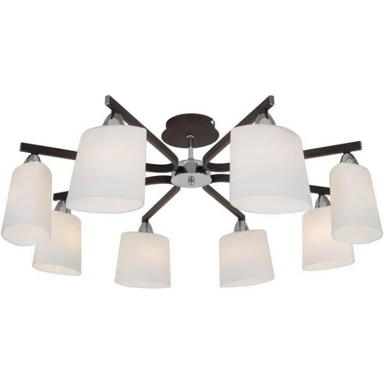Преобладающий цвет люстры: Белый, плафонов: Белый, арматуры: Коричневый; материал изготовления арматуры: Дерево, размеры, мм: / высота 280 / диаметр 720. Общая мощность – 480 Ватт, а максимальная площадь освещения до 26,7 м2. Основной тип ламп, предусмотренный производителем: Накаливания с цоколем E14. В зависимости от предпочтений можно использовать лампы теплового, холодного или нейтрального света, за исключением люстр с типом цоколя LED.