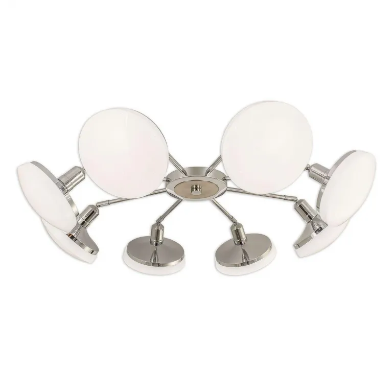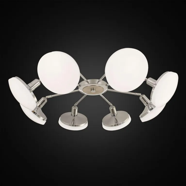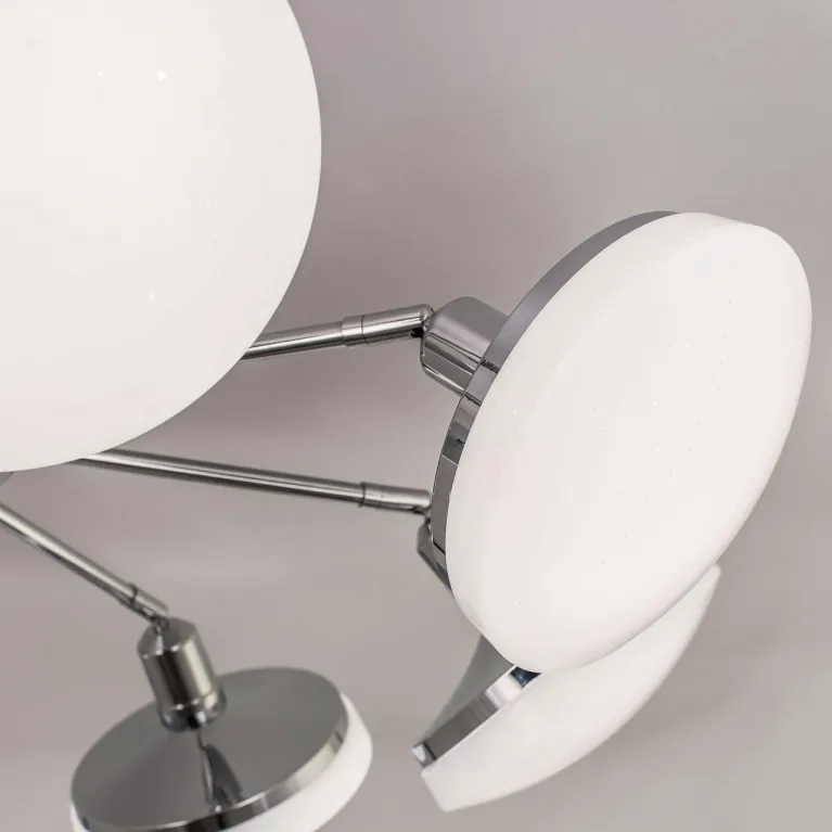 Преобладающий цвет плафонов: Белый, арматуры: Хром; материал изготовления арматуры: Металл, размеры, мм: / высота 185 / диаметр 1000. Общая мощность – 96 Ватт, а максимальная площадь освещения до 32 м2. Основной тип ламп, предусмотренный производителем: Светодиодная с цоколем LED. В зависимости от предпочтений можно использовать лампы теплового, холодного или нейтрального света, за исключением люстр с типом цоколя LED.