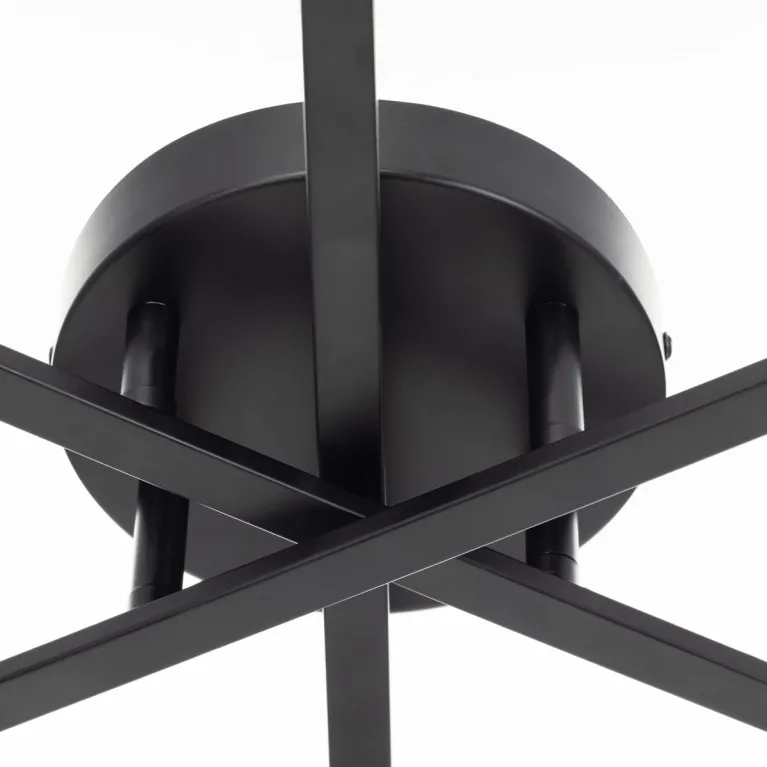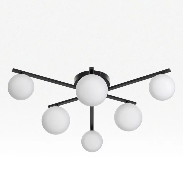 Преобладающий цвет плафонов: Белый, арматуры: Черный; материал изготовления арматуры: Металл, размеры, мм: / высота 210 / диаметр 710. Общая мощность – 90 Ватт. Основной тип ламп, предусмотренный производителем: Светодиодная с цоколем G9. В зависимости от предпочтений можно использовать лампы теплового, холодного или нейтрального света, за исключением люстр с типом цоколя LED.