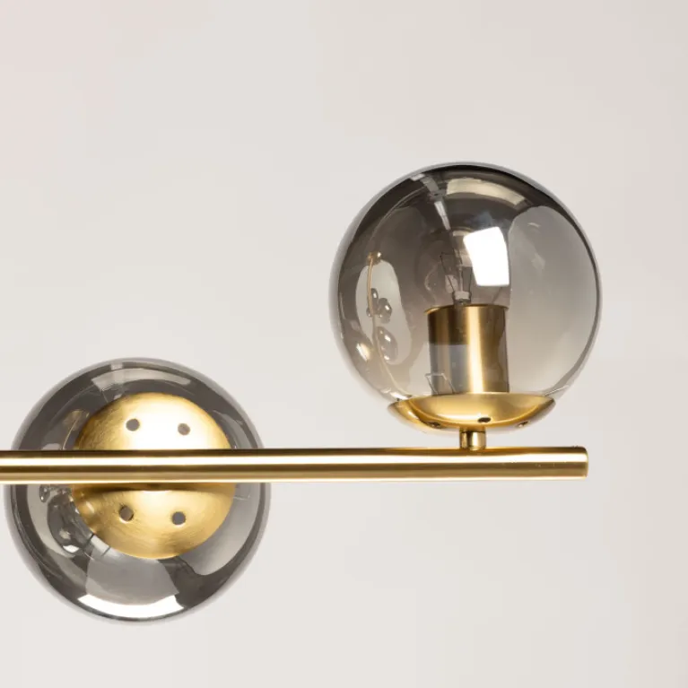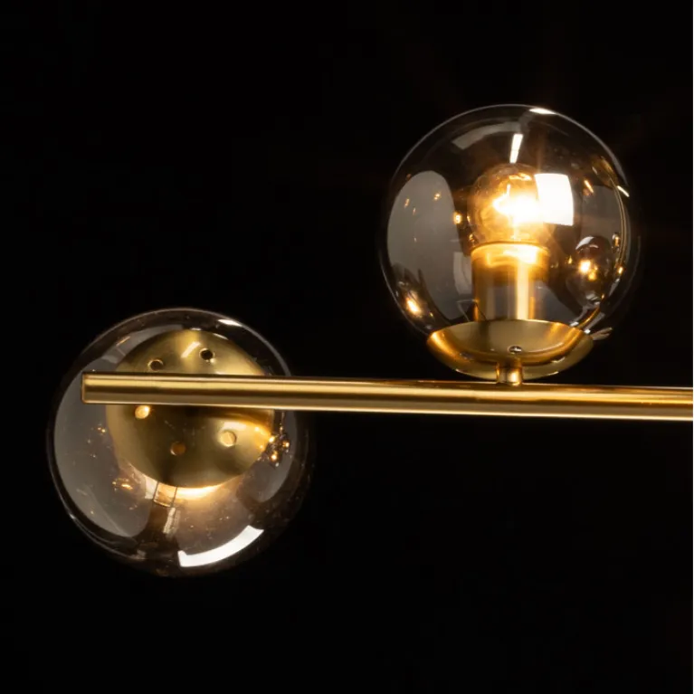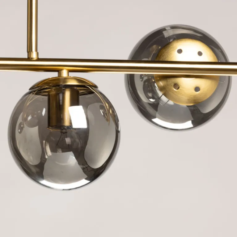 Преобладающий цвет плафонов: Дымчатый, арматуры: Медь; материал изготовления арматуры: Металл, размеры, мм: длина 880 / ширина 295 / высота 400 Общая мощность – 360 Ватт, а максимальная площадь освещения до 18 м2. Основной тип ламп, предусмотренный производителем: Накаливания с цоколем E27. В зависимости от предпочтений можно использовать лампы теплового, холодного или нейтрального света, за исключением люстр с типом цоколя LED.