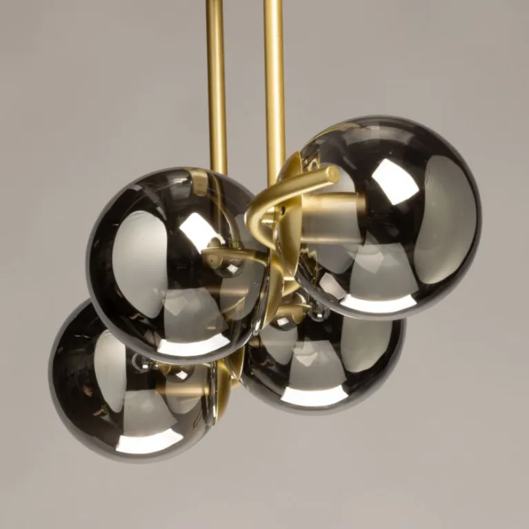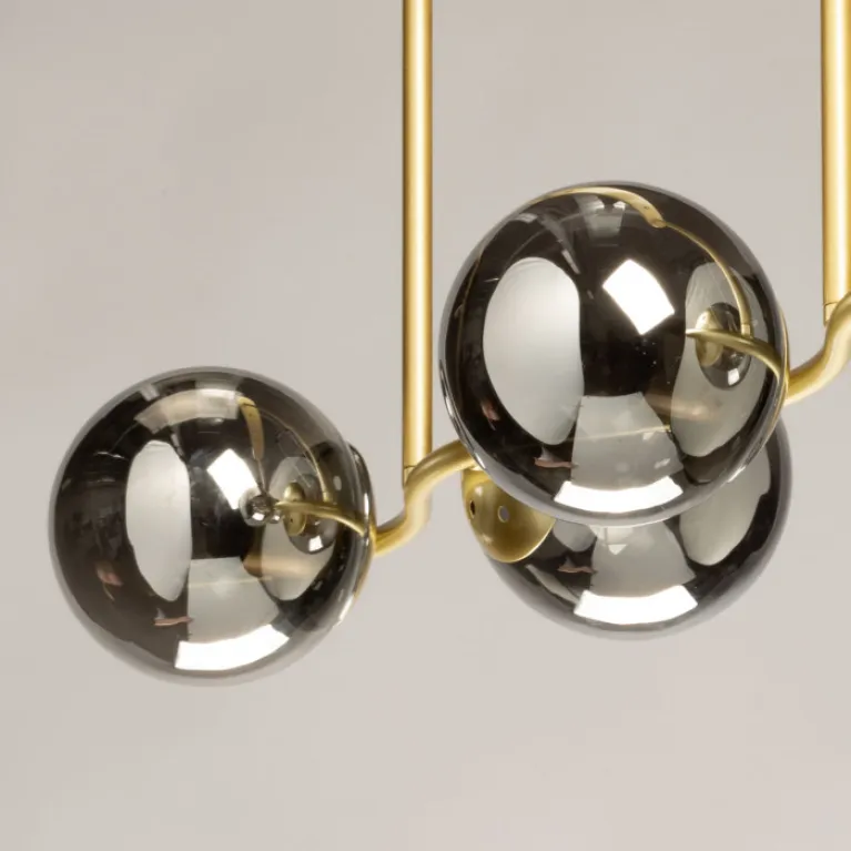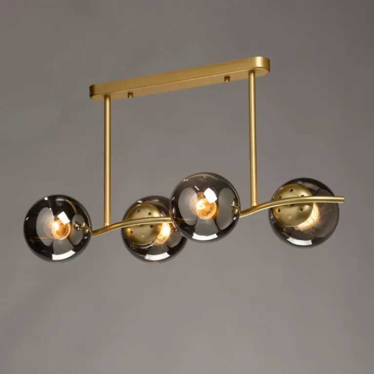 Преобладающий цвет плафонов: Дымчатый, арматуры: Золото; материал изготовления арматуры: Металл, размеры, мм: длина 640 / ширина 250 / высота 350 Общая мощность – 160 Ватт, а максимальная площадь освещения до 8 м2. Основной тип ламп, предусмотренный производителем: Накаливания с цоколем E27. В зависимости от предпочтений можно использовать лампы теплового, холодного или нейтрального света, за исключением люстр с типом цоколя LED.
