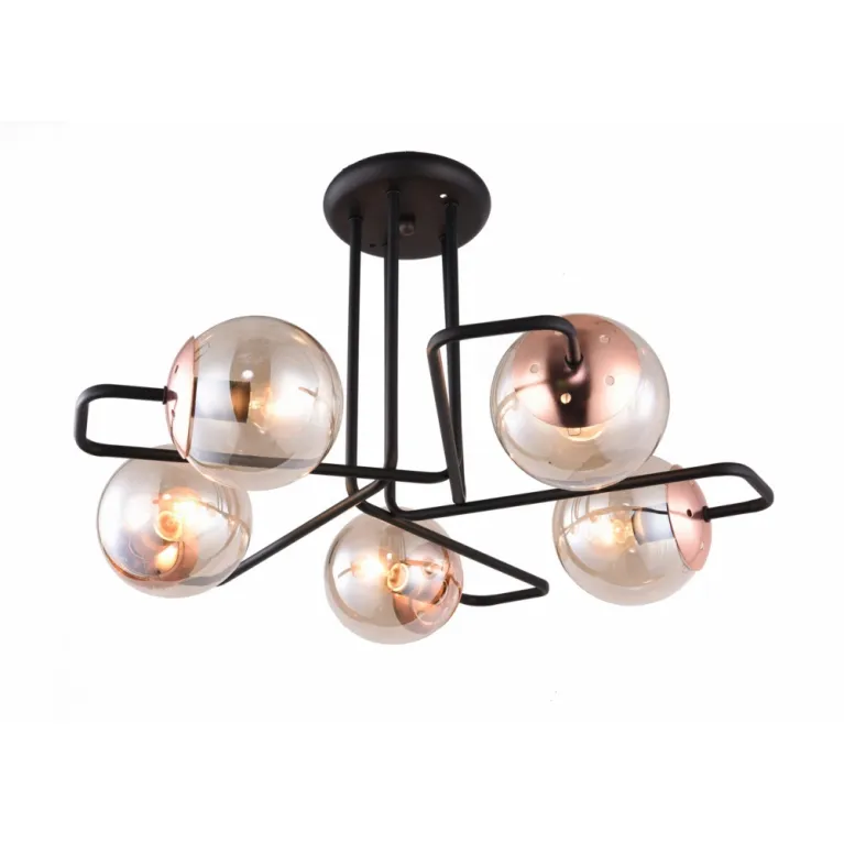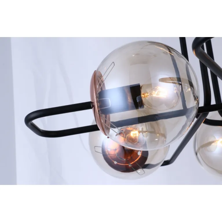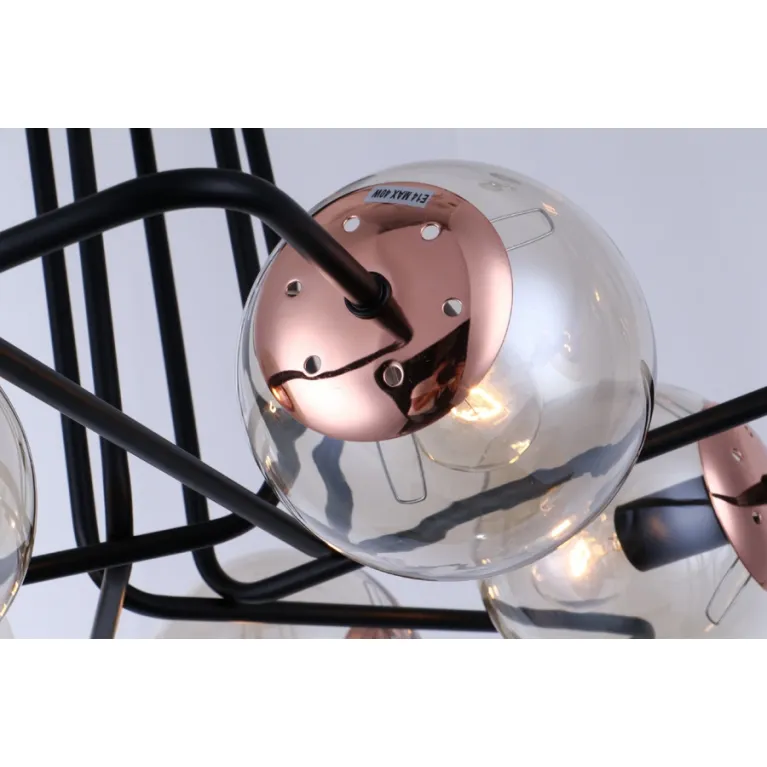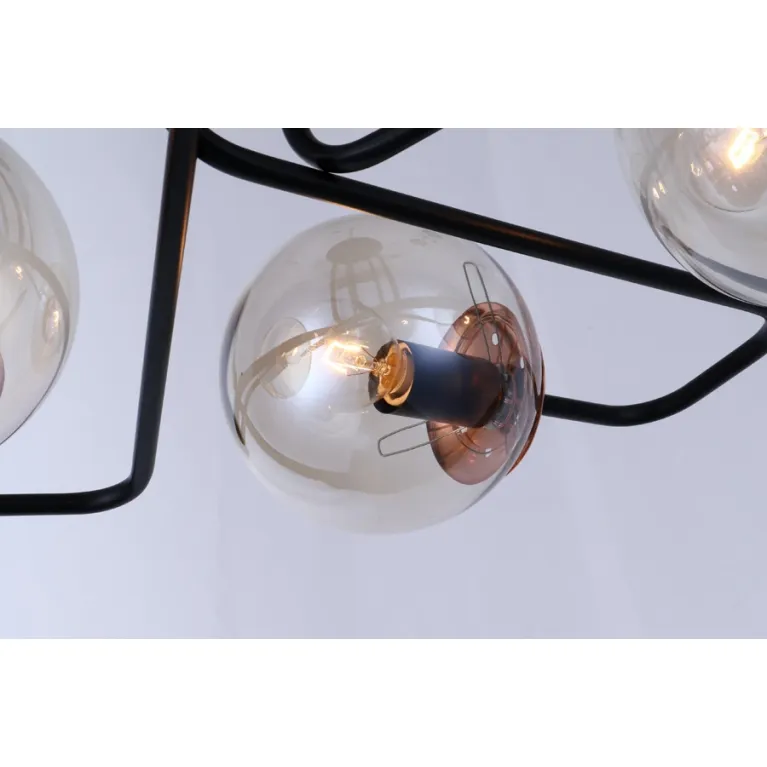 Преобладающий цвет плафонов: Прозрачный, арматуры: Черный; материал изготовления арматуры: Металл, размеры, мм: длина 600 / ширина 600 / высота 350 Общая мощность – 200 Ватт, а максимальная площадь освещения до 10 м2. Основной тип ламп, предусмотренный производителем: Накаливания с цоколем E14. В зависимости от предпочтений можно использовать лампы теплового, холодного или нейтрального света, за исключением люстр с типом цоколя LED.