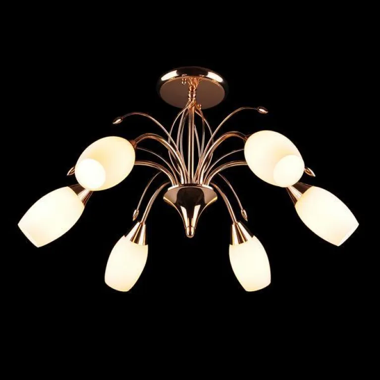 Люстра оснащена шестью лампами, что обеспечивает яркое и равномерное освещение пространства. Она изготовлена из прочного металла с эффектным золотым покрытием, которое придаёт изделию изысканный и утончённый вид. Плафоны выполнены из качественного прозрачного стекла.