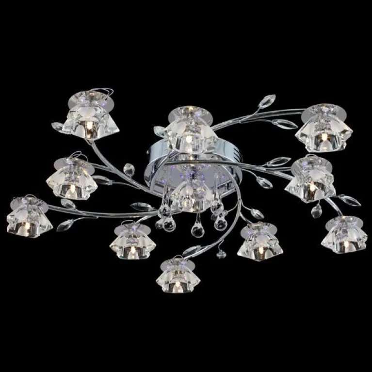 Преобладающий цвет люстры: Хром, плафонов: Прозрачный, арматуры: Хром; материал изготовления арматуры: Металл, размеры, мм: длина 800 / ширина 800 / высота 140 Общая мощность – 220 Ватт, а максимальная площадь освещения до 12,2 м2. Основной тип ламп, предусмотренный производителем: Галогеновая с цоколем G4. В зависимости от предпочтений можно использовать лампы теплового, холодного или нейтрального света, за исключением люстр с типом цоколя LED.