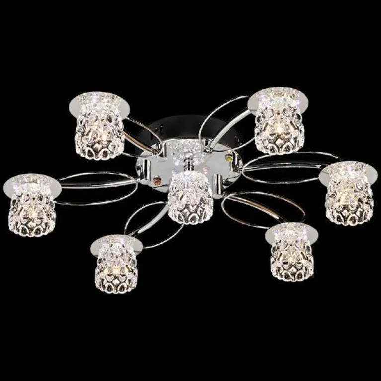 Преобладающий цвет люстры: Хром, плафонов: Прозрачный, арматуры: Хром; материал изготовления арматуры: Металл, размеры, мм: / высота 170 / диаметр 550. Общая мощность – 140 Ватт, а максимальная площадь освещения до 7,8 м2. Основной тип ламп, предусмотренный производителем: Галогеновая с цоколем G4. В зависимости от предпочтений можно использовать лампы теплового, холодного или нейтрального света, за исключением люстр с типом цоколя LED.