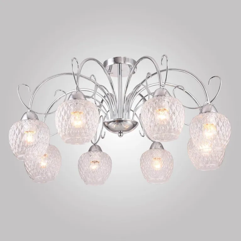 Преобладающий цвет люстры: Хром, плафонов: Прозрачный, арматуры: Хром; материал изготовления арматуры: Металл, размеры, мм: / высота 390 / диаметр 750. Общая мощность – 480 Ватт, а максимальная площадь освещения до 32 м2. Основной тип ламп, предусмотренный производителем: Накаливания с цоколем E27. В зависимости от предпочтений можно использовать лампы теплового, холодного или нейтрального света, за исключением люстр с типом цоколя LED.