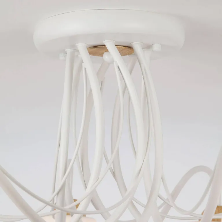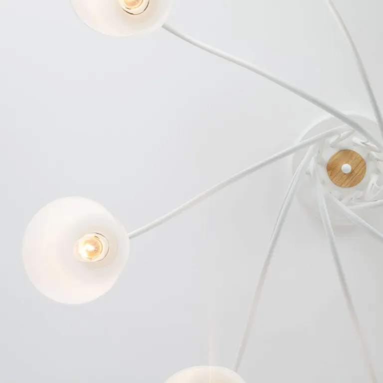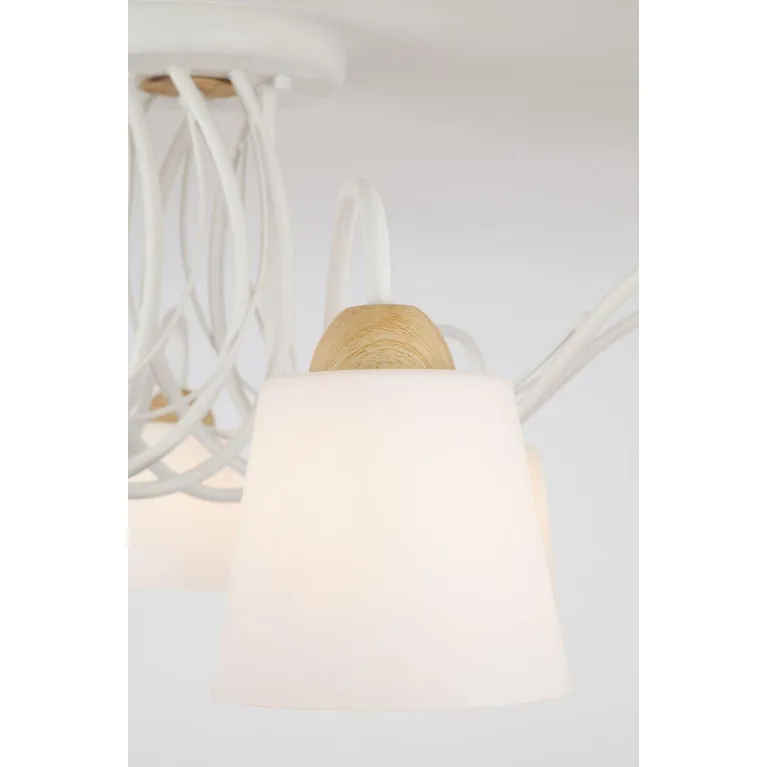 Преобладающий цвет плафонов: Белый, арматуры: Белый; материал изготовления арматуры: Металл, размеры, мм: / высота 350 / диаметр 870. Общая мощность – 400 Ватт, а максимальная площадь освещения до 16 м2. Основной тип ламп, предусмотренный производителем: Накаливания с цоколем E27. В зависимости от предпочтений можно использовать лампы теплового, холодного или нейтрального света, за исключением люстр с типом цоколя LED.