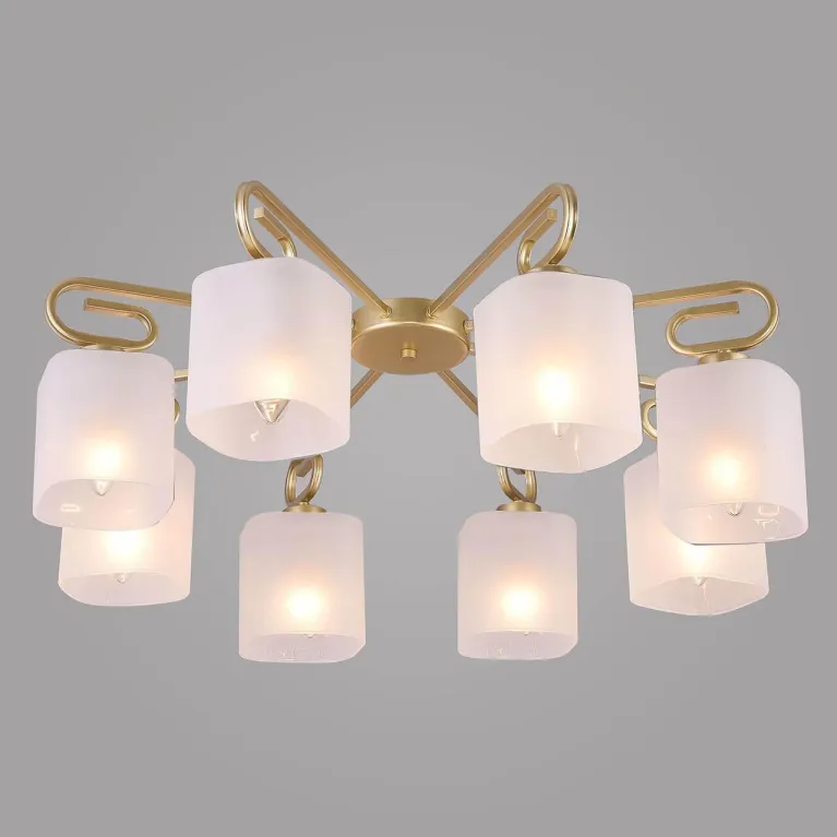 Преобладающий цвет люстры: Белый, плафонов: Белый, арматуры: Латунь; материал изготовления арматуры: Металл, размеры, мм: / высота 240 / диаметр 720. Общая мощность – 480 Ватт, а максимальная площадь освещения до 32 м2. Основной тип ламп, предусмотренный производителем: Накаливания с цоколем E27. В зависимости от предпочтений можно использовать лампы теплового, холодного или нейтрального света, за исключением люстр с типом цоколя LED.
