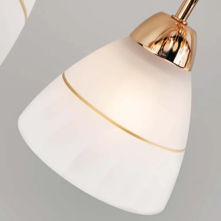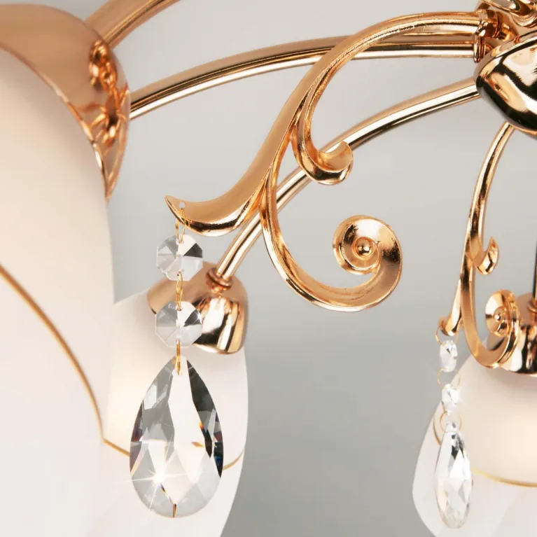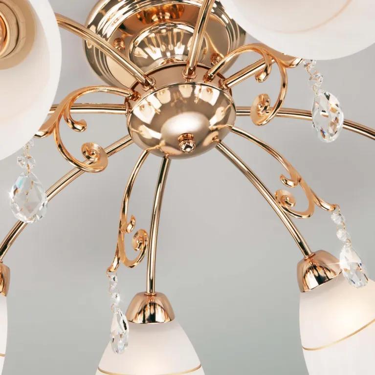 Преобладающий цвет люстры: Белый, плафонов: Белый, арматуры: Золото; материал изготовления арматуры: Металл, размеры, мм: / высота 330 / диаметр 740. Общая мощность – 480 Ватт, а максимальная площадь освещения до 36 м2. Основной тип ламп, предусмотренный производителем: Накаливания с цоколем E27. В зависимости от предпочтений можно использовать лампы теплового, холодного или нейтрального света, за исключением люстр с типом цоколя LED.
