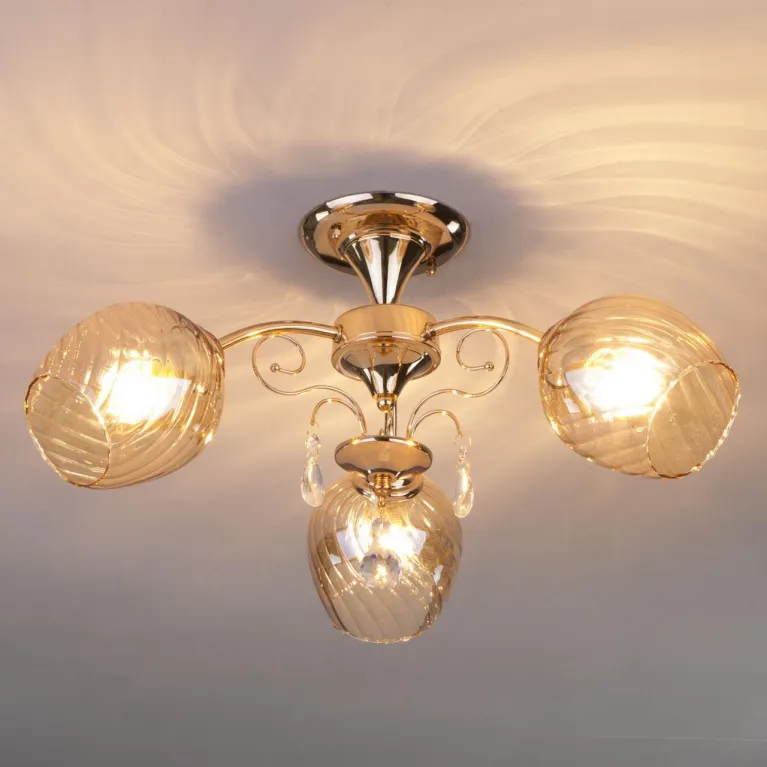 Преобладающий цвет люстры: Янтарный, плафонов: Янтарный, арматуры: Золото; материал изготовления арматуры: Металл, размеры, мм: / высота 280 / диаметр 500. Общая мощность – 180 Ватт, а максимальная площадь освещения до 14 м2. Основной тип ламп, предусмотренный производителем: Накаливания с цоколем E27. В зависимости от предпочтений можно использовать лампы теплового, холодного или нейтрального света, за исключением люстр с типом цоколя LED.