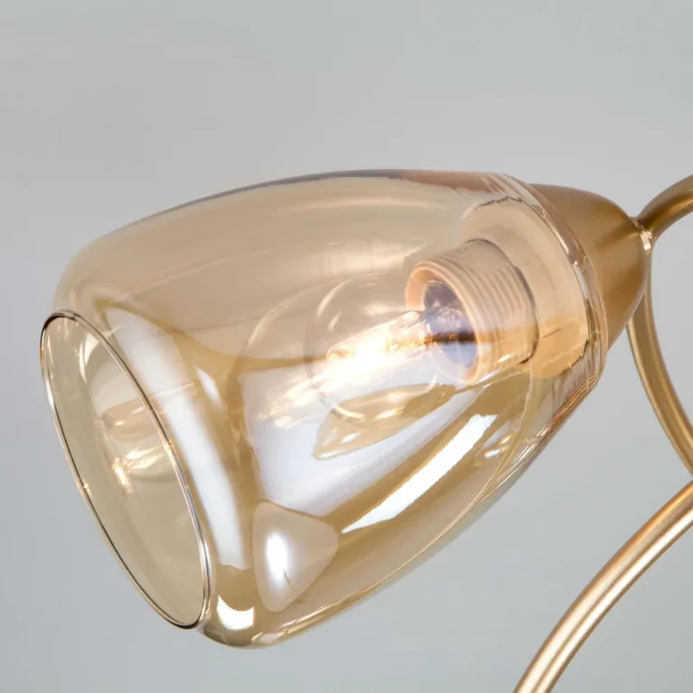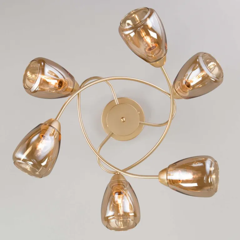 Преобладающий цвет люстры: Янтарный, плафонов: Янтарный, арматуры: Золото; материал изготовления арматуры: Металл, размеры, мм: / высота 430 / диаметр 720. Общая мощность – 360 Ватт, а максимальная площадь освещения до 24 м2. Основной тип ламп, предусмотренный производителем: Накаливания с цоколем E27. В зависимости от предпочтений можно использовать лампы теплового, холодного или нейтрального света, за исключением люстр с типом цоколя LED.