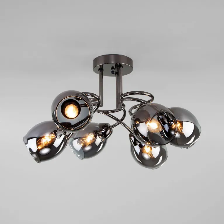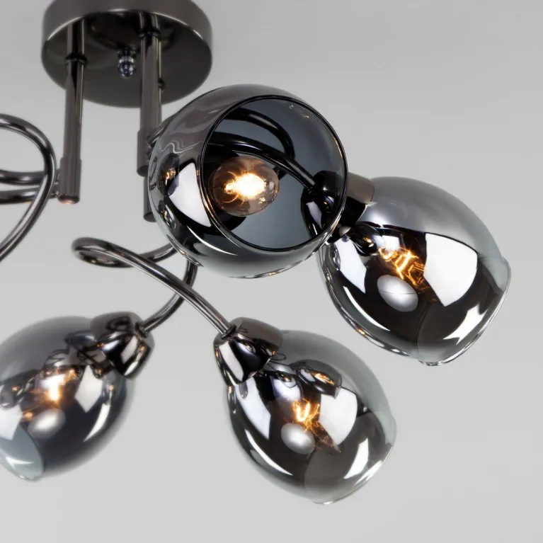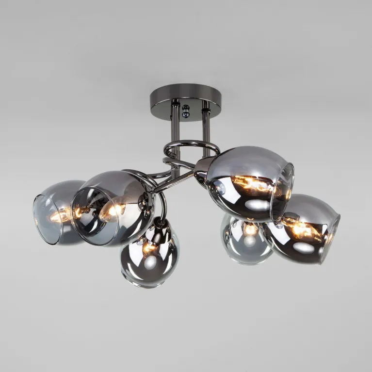 Преобладающий цвет люстры: Дымчатый, плафонов: Дымчатый, арматуры: Черный; материал изготовления арматуры: Металл, размеры, мм: / высота 275 / диаметр 520. Общая мощность – 240 Ватт, а максимальная площадь освещения до 16 м2. Основной тип ламп, предусмотренный производителем: Накаливания с цоколем E14. В зависимости от предпочтений можно использовать лампы теплового, холодного или нейтрального света, за исключением люстр с типом цоколя LED.