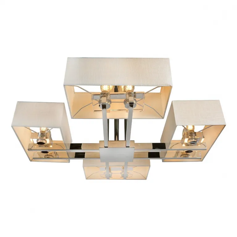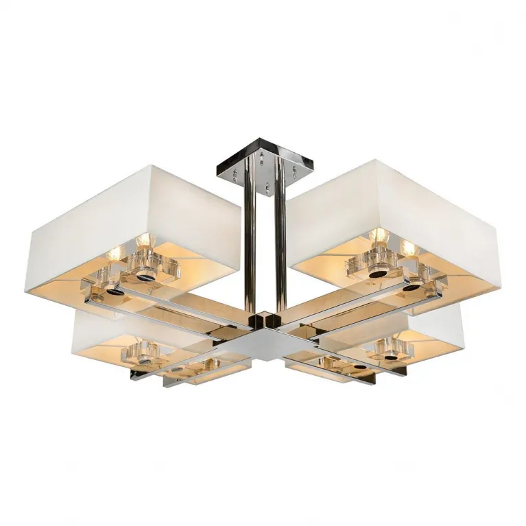 Корпус светильника выполнен из прочного металла с хромированным покрытием, который отличается долговечностью и устойчивостью к внешним воздействиям. Плафоны изготовлены из белого матового стекла, что обеспечивает мягкое и равномерное рассеивание света. Люстра совместима с лампами типа E27, что позволяет использовать как традиционные лампы накаливания, так и энергосберегающие или светодиодные лампы, подходящие для реализации различных концепций освещения.