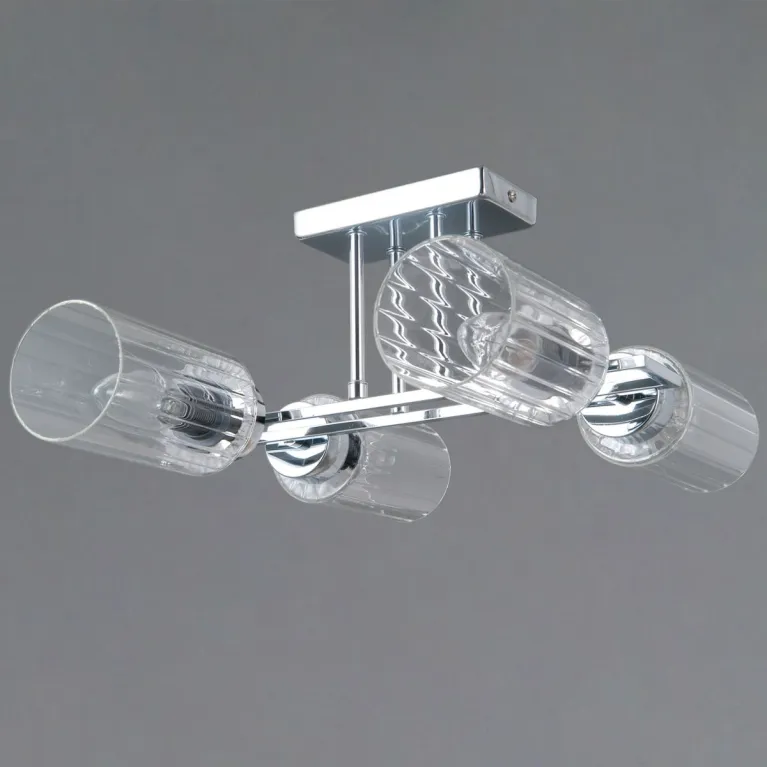 Преобладающий цвет плафонов: Прозрачный, арматуры: Хром; материал изготовления арматуры: Металл, размеры, мм: длина 330 / ширина 390 / высота 170 Общая мощность – 160 Ватт, а максимальная площадь освещения до 24 м2. Основной тип ламп, предусмотренный производителем: Накаливания с цоколем E14. В зависимости от предпочтений можно использовать лампы теплового, холодного или нейтрального света, за исключением люстр с типом цоколя LED.