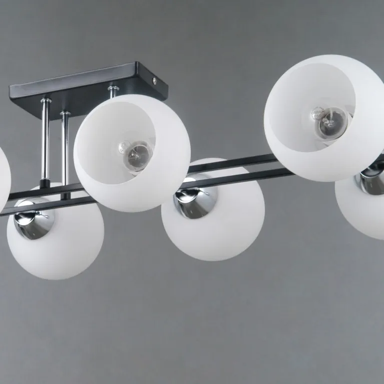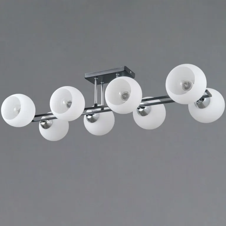 Преобладающий цвет плафонов: Белый, арматуры: Черный; материал изготовления арматуры: Металл, размеры, мм: длина 810 / ширина 320 / высота 200 Общая мощность – 320 Ватт, а максимальная площадь освещения до 48 м2. Основной тип ламп, предусмотренный производителем: Накаливания с цоколем E27. В зависимости от предпочтений можно использовать лампы теплового, холодного или нейтрального света, за исключением люстр с типом цоколя LED.