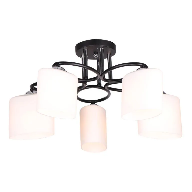 Преобладающий цвет люстры: Белый, плафонов: Белый, арматуры: Черный; материал изготовления арматуры: Металл, размеры, мм: длина 550 / высота 260 Общая мощность – 300 Ватт. Основной тип ламп, предусмотренный производителем: Накаливания с цоколем E27. В зависимости от предпочтений можно использовать лампы теплового, холодного или нейтрального света, за исключением люстр с типом цоколя LED.
